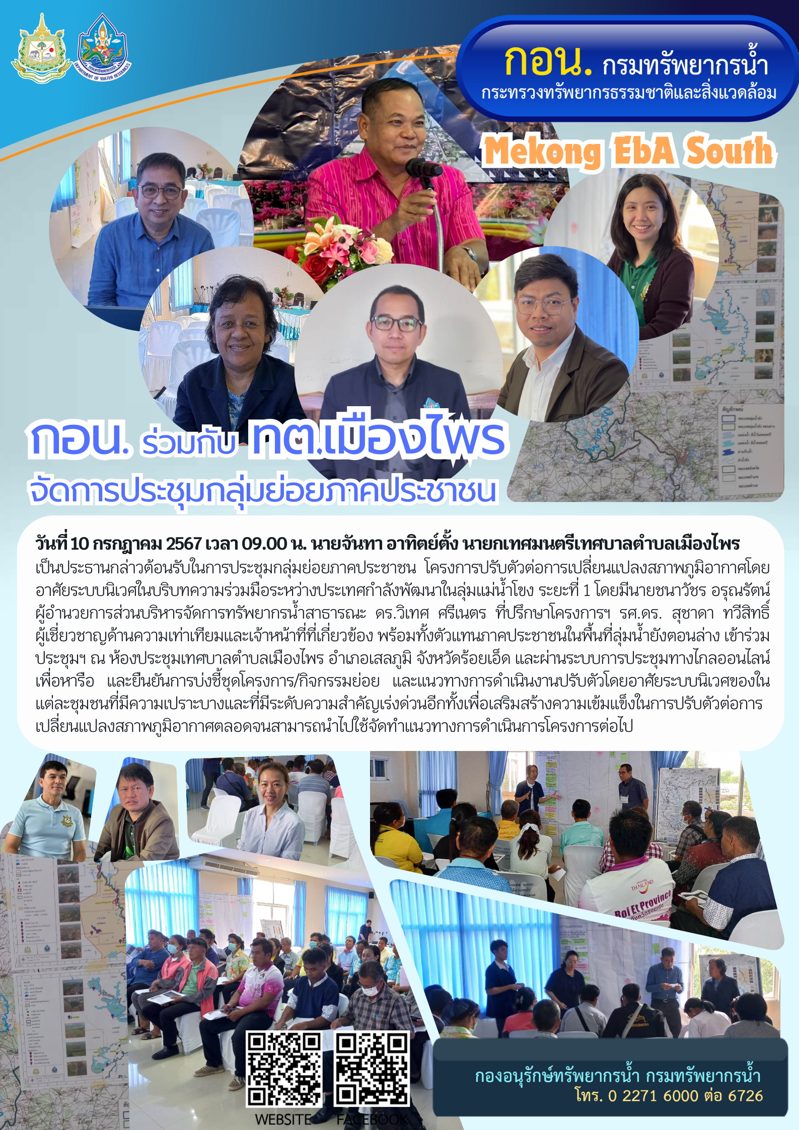 วันที่ 10 กรกฎาคม 2567 เวลา 09.00 น. นายจันทา อาทิตย์ตั้ง นายกเทศมนตรีเทศบาลตำบลเมืองไพรเป็นประธานกล่าวต้อนรับในการประชุมกลุ่มย่อยภาคประชาชน โครงการปรับตัวต่อการเปลี่ยนแปลงสภาพภูมิอากาศโดยอาศัยระบบนิเวศในบริบทความร่วมมือระหว่างประเทศกำลังพัฒนาในลุ่มแม่น้ำโขง ระยะที่ 1 โดยมีนายชนาวัชร อรุณรัตน์ผู้อำนวยการส่วนบริหารจัดการทรัพยากรน้ำสาธารณะ ดร.วิเทศ ศรีเนตร ที่ปรึกษาโครงการฯ รศ.ดร. สุชาดา ทวีสิทธิ์ ผู้เชี่ยวชาญด้านความเท่าเทียมและเจ้าหน้าที่ที่เกี่ยวข้อง พร้อมทั้งตัวแทนภาคประชาชนในพื้นที่ลุ่มน้ำยังตอนล่าง เข้าร่วมประชุมฯ ณ ห้องประชุมเทศบาลตำบลเมืองไพร อำเภอเสลภูมิ จังหวัดร้อยเอ็ด และผ่านระบบการประชุมทางไกลออนไลน์