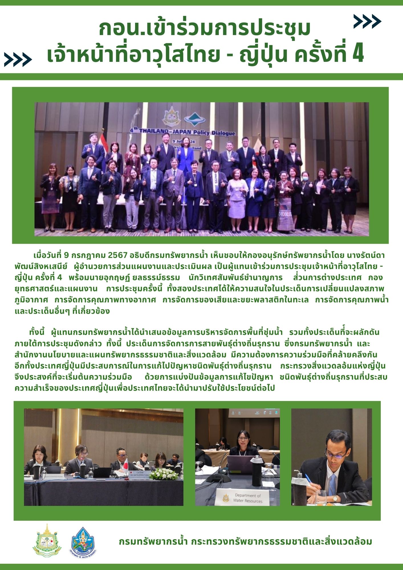 เมื่อวันที่ 9 กรกฎาคม 2567 อธิบดีกรมทรัพยากรน้ำ เห็นชอบให้กองอนุรักษ์ทรัพยากรน้ำโดย นางรัตน์ดา พัฒน์สิงหเสนีย์ ผู้อํานวยการส่วนแผนงานและประเมินผล เป็นผู้แทนเข้าร่วมการประชุมเจ้าหน้าที่อาวุโสไทย - ญี่ปุ่น ครั้งที่ 4 พร้อมนายอุกฤษฎ์ ยลธรรม์ธรรม นักวิเทศสัมพันธ์ชํานาญการ ส่วนการต่างประเทศ กองยุทธศาสตร์และแผนงาน