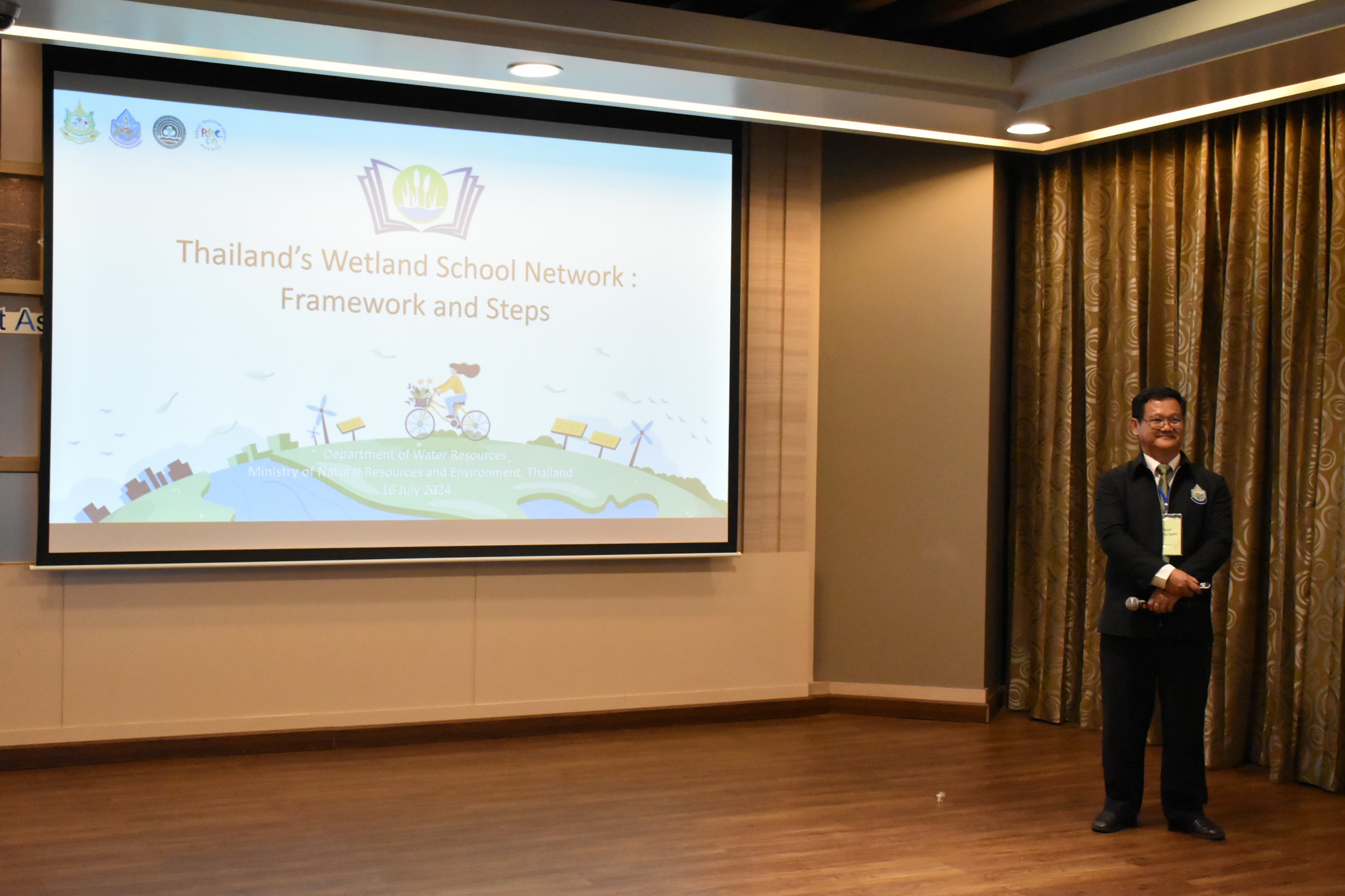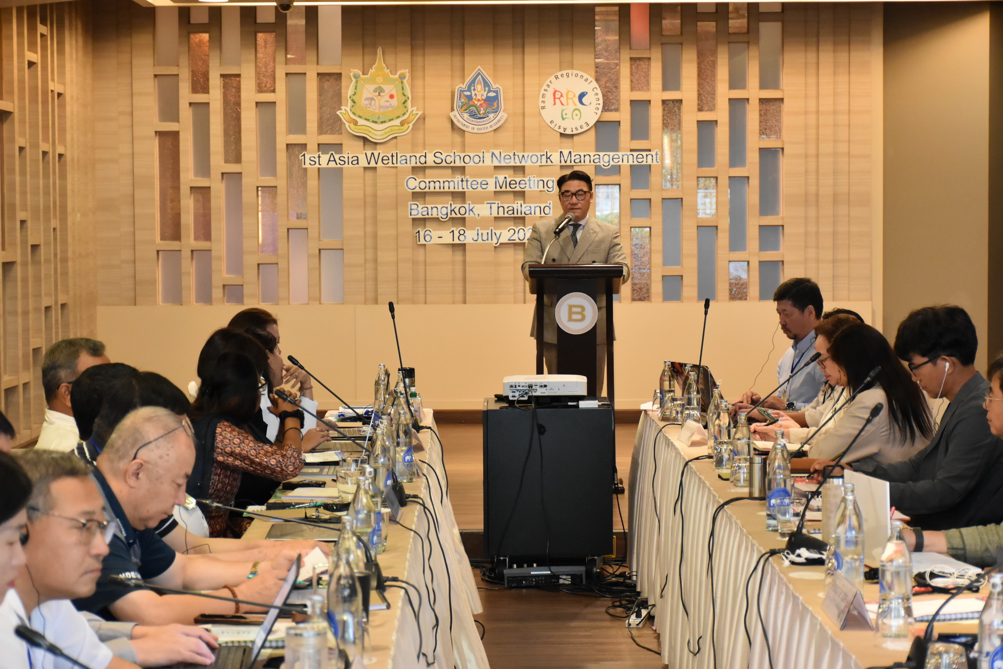 วันที่ 16 - 17 กรกฎาคม 2567 นายธีระชุณ บุญสิทธิ์ รองอธิบดีกรมทรัพยากรน้ำ เป็นผู้แทนกรมทรัพยากรน้ำในการกล่าวต้อนรับ ผู้เข้าร่วมประชุมเชิงปฏิบัติการคณะกรรมการบริหารเครือข่ายโรงเรียนพื้นที่ชุ่มน้ำแห่งเอเชีย (AWSN) พร้อมด้วยนายพิพัฒน์ เรืองงาม ผู้เชี่ยวชาญด้านส่งเสริมและประสานมวลชน กองอนุรักษ์ทรัพยากรน้ำ เป็นผู้กล่าวรายงานและบรรยายเรื่อง การจัดการเรียนการสอนเรื่องพื้นที่ชุ่มน้ำในประเทศไทย รวมทั้งผู้อำนวยการส่วนอนุสัญญาพื้นที่ชุ่มน้ำและเจ้าหน้าที่ที่เกี่ยวข้อง เข้าร่วม ณ โรงแรมเดอะเบอร์เคลีย์ ประตูน้ำ โดยมีผู้เข้าร่วมจากประเทศต่าง ๆ ได้แก่ ญี่ปุ่น กัมพูชา ลาว อินเดีย ศรีลังกา ฟิลิปปินส์ จีน มองโกเลีย เกาหลี และประเทศไทย เป็นผู้แทนจากหน่วยงานทางด้านการศึกษา และเจ้าหน้าที่จากศูนย์แรมซาร์ภูมิภาคเอเชียตะวันออก (RRC-EA) นำโดย Mr.Suh Seung Oh ผู้อำนวยการ รวมทั้งสิ้นจำนวน 40 คน ซึ่งการประชุมในครั้งนี้ถือเป็นเวทีสำคัญที่เปิดโอกาสให้นำไปสู่การทำงานร่วมกันระหว่างเครือข่ายการศึกษาพื้นที่ชุ่มน้ำแห่งเอเชีย เพื่อการคุ้มครองและอนุรักษ์พื้นที่ชุ่มน้ำทั้งในระดับประเทศและระหว่างประเทศอย่างยั่งยืน