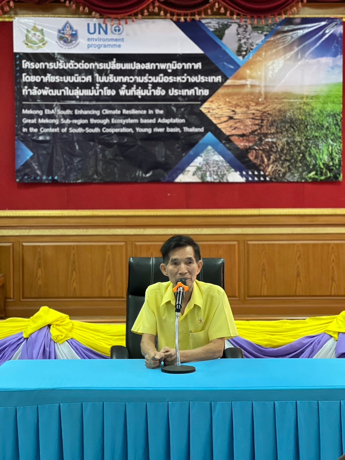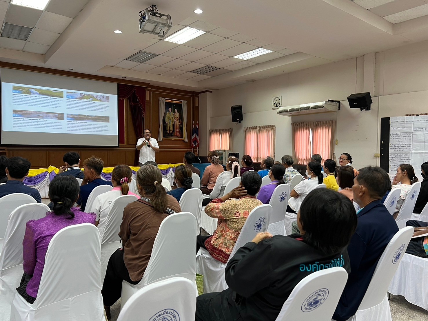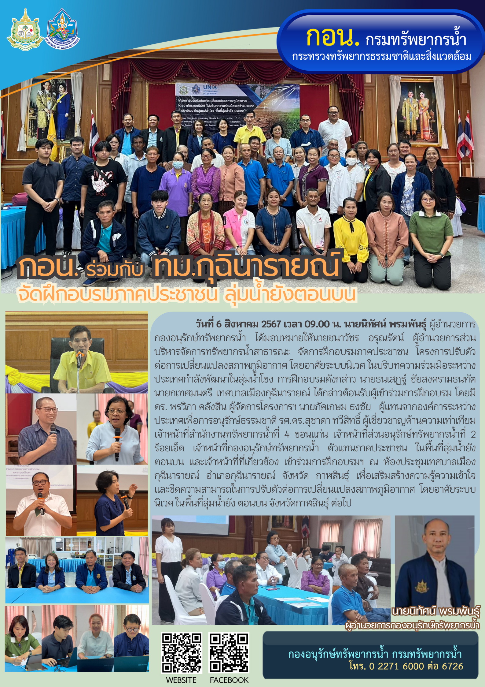 วันที่ 6 สิงหาคม 2567 เวลา 09.00 น. นายนิทัศน์ พรมพันธุ์ ผู้อำนวยการ กองอนุรักษ์ทรัพยากรน้ำ ได้มอบหมายให้นายชนาวัชร อรุณรัตน์ ผู้อำนวยการส่วนบริหารจัดการทรัพยากรน้ำสาธารณะ จัดการฝึกอบรมภาคประชาชน โครงการปรับตัวต่อการเปลี่ยนแปลงสภาพภูมิอากาศ โดยอาศัยระบบนิเวศ ในบริบทความร่วมมือระหว่างประเทศกำลังพัฒนาในลุ่มน้ำโขง การฝึกอบรมดังกล่าว นายธนเสฏฐ์ ชัยสงครามธนทัต นายกเทศมนตรี เทศบาลเมืองกุฉินารายณ์ ได้กล่าวต้อนรับผู้เข้าร่วมการฝึกอบรม โดยมี ดร. พรวิภา คลังสิน ผู้จัดการโครงการฯ นายภัคเกษม ธงชัย ผู้แทนจากองค์การระหว่างประเทศเพื่อการอนุรักษ์ธรรมชาติ รศ.ดร.สุชาดา ทวีสิทธิ์ ผู้เชี่ยวชาญด้านความเท่าเทียม เจ้าหน้าที่สำนักงานทรัพยากรน้ำที่ 4 ขอนแก่น เจ้าหน้าที่ส่วนอนุรักษ์ทรัพยากรน้ำที่ 2 ร้อยเอ็ด เจ้าหน้าที่กองอนุรักษ์ทรัพยากรน้ำ ตัวแทนภาคประชาชน ในพื้นที่ลุ่มน้ำยัง ตอนบน และเจ้าหน้าที่ที่เกี่ยวข้อง เข้าร่วมการฝึกอบรมฯ ณ ห้องประชุมเทศบาลเมือง กุฉินารายณ์ อำเภอกุฉินารายณ์ จังหวัด กาฬสินธุ์ เพื่อเสริมสร้างความรู้ความเข้าใจ และขีดความสามารถในการปรับตัวต่อการเปลี่ยนแปลงสภาพภูมิอากาศ โดยอาศัยระบบนิเวศ ในพื้นที่ลุ่มน้ำยัง ตอนบน จังหวัดกาฬสินธุ์ ต่อไป