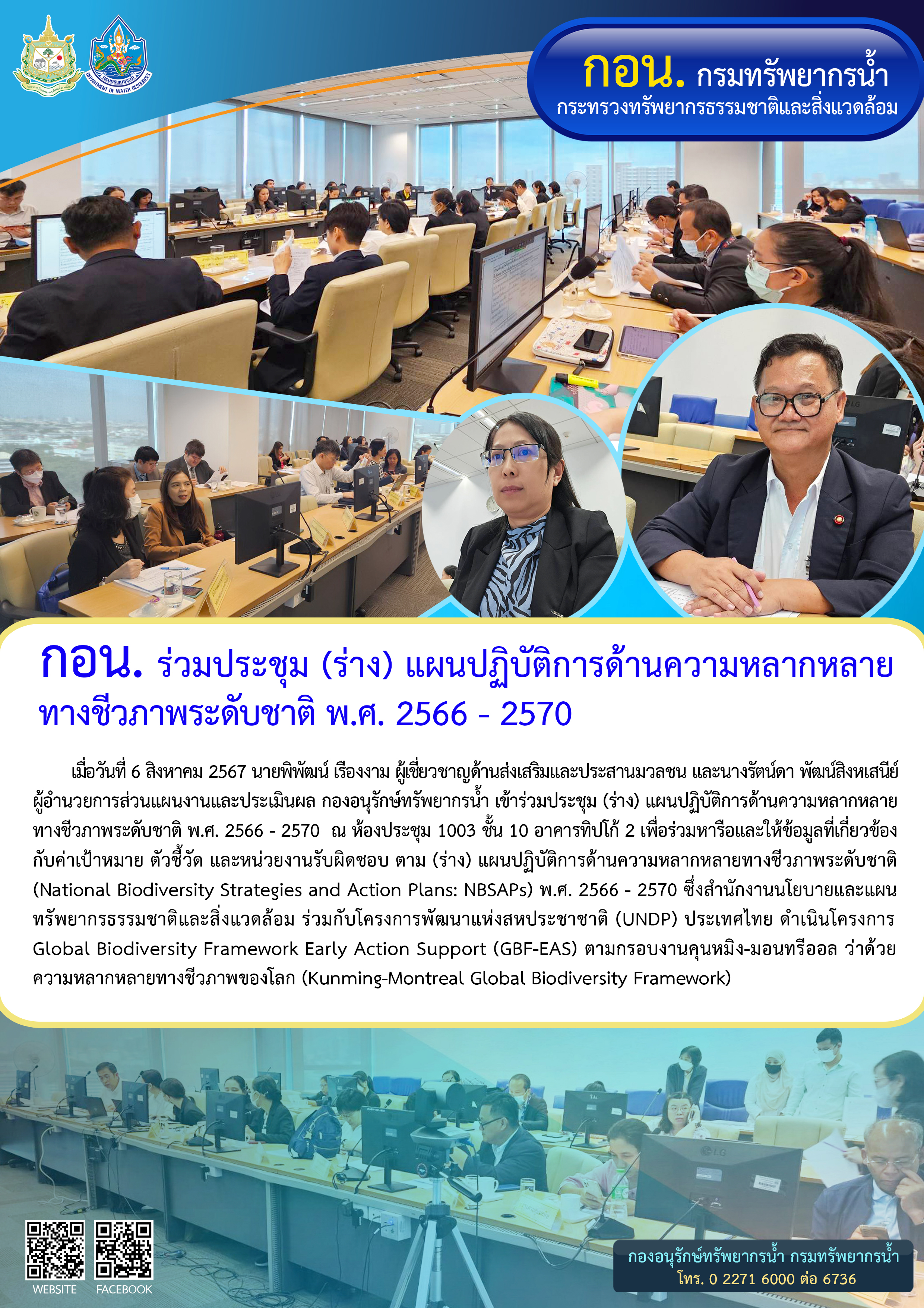 เมื่อวันที่ 6 สิงหาคม 2567 นายพิพัฒน์ เรืองงาม ผู้เชี่ยวชาญด้านส่งเสริมและประสานมวลชน และนางรัตน์ดา พัฒน์สิงหเสนีย์ ผู้อำนวยการส่วนแผนงานและประเมินผล กองอนุรักษ์ทรัพยากรน้ำ เข้าร่วมประชุม (ร่าง) แผนปฏิบัติการด้านความหลากหลายทางชีวภาพระดับชาติ พ.ศ. 2566 - 2570 ณ ห้องประชุม 1003 ชั้น 10 อาคารทิปโก้ 2 เพื่อร่วมหารือและให้ข้อมูลที่เกี่ยวข้องกับค่าเป้าหมาย ตัวชี้วัด และหน่วยงานรับผิดชอบ ตาม (ร่าง) แผนปฏิบัติการด้านความหลากหลายทางชีวภาพระดับชาติ (National Biodiversity Strategies and Action Plans: NBSAPs) พ.ศ. 2566 - 2570