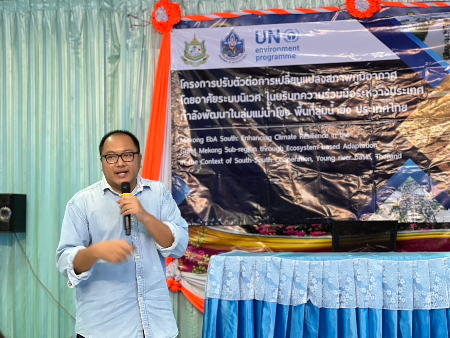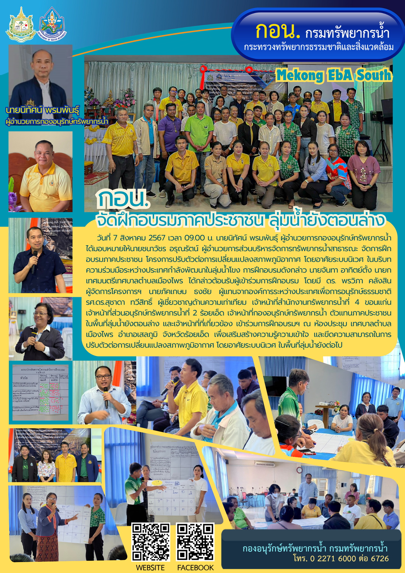 วันที่ 7 สิงหาคม 2567 เวลา 09.00 น. นายนิทัศน์ พรมพันธุ์ ผู้อำนวยการกองอนุรักษ์ทรัพยากรน้ำ ได้มอบหมายให้นายชนาวัชร อรุณรัตน์ ผู้อำนวยการส่วนบริหารจัดการทรัพยากรน้ำสาธารณะ จัดการฝึกอบรมภาคประชาชน โครงการปรับตัวต่อการเปลี่ยนแปลงสภาพภูมิอากาศ โดยอาศัยระบบนิเวศ ในบริบทความร่วมมือระหว่างประเทศกำลังพัฒนาในลุ่มน้ำโขง การฝึกอบรมดังกล่าว นายจันทา อาทิตย์ตั้ง นายกเทศมนตรีเทศบาลตำบลเมืองไพร ได้กล่าวต้อนรับผู้เข้าร่วมการฝึกอบรม โดยมี ดร. พรวิภา คลังสิน ผู้จัดการโครงการฯ นายภัคเกษม ธงชัย ผู้แทนจากองค์การระหว่างประเทศเพื่อการอนุรักษ์ธรรมชาติ รศ.ดร.สุชาดา ทวีสิทธิ์ ผู้เชี่ยวชาญด้านความเท่าเทียม เจ้าหน้าที่สำนักงานทรัพยากรน้ำที่ 4 ขอนแก่น เจ้าหน้าที่ส่วนอนุรักษ์ทรัพยากรน้ำที่ 2 ร้อยเอ็ด เจ้าหน้าที่กองอนุรักษ์ทรัพยากรน้ำ ตัวแทนภาคประชาชน ในพื้นที่ลุ่มน้ำยังตอนล่าง และเจ้าหน้าที่ที่เกี่ยวข้อง เข้าร่วมการฝึกอบรมฯ ณ ห้องประชุม เทศบาลตำบลเมืองไพร อำเภอเสลภูมิ จังหวัดร้อยเอ็ด เพื่อเสริมสร้างความรู้ความเข้าใจ และขีดความสามารถในการปรับตัวต่อการเปลี่ยนแปลงสภาพภูมิอากาศ โดยอาศัยระบบนิเวศ ในพื้นที่ลุ่มน้ำยังต่อไป