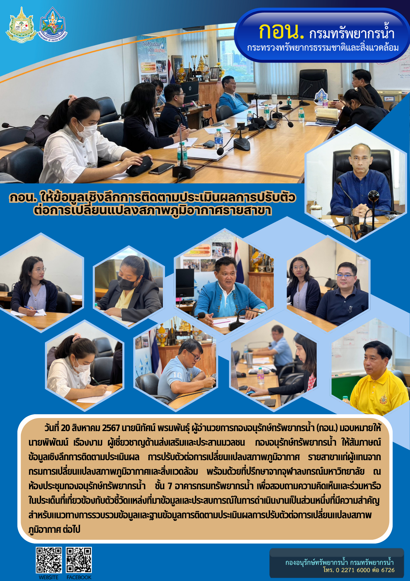 วันที่ 20 สิงหาคม 2567 นายนิทัศน์ พรมพันธุ์ ผู้อำนวยการกองอนุรักษ์ทรัพยากรน้ำ (กอน.) มอบหมายให้ นายพิพัฒน์ เรืองงาม ผู้เชี่ยวชาญด้านส่งเสริมและประสานมวลชน กองอนุรักษ์ทรัพยากรน้ำ ให้สัมภาษณ์ข้อมูลเชิงลึกการติดตามประเมินผลการปรับตัวต่อการเปลี่ยนแปลงสภาพภูมิอากาศรายสาขา แก่ผู้แทนจากกรมการเปลี่ยนแปลงสภาพภูมิอากาศและสิ่งแวดล้อม พร้อมด้วยที่ปรึกษาจากจุฬาลงกรณ์มหาวิทยาลัย ณ ห้องประชุมกองอนุรักษ์ทรัพยากรน้ำ ชั้น 7 อาคารกรมทรัพยากรน้ำ
