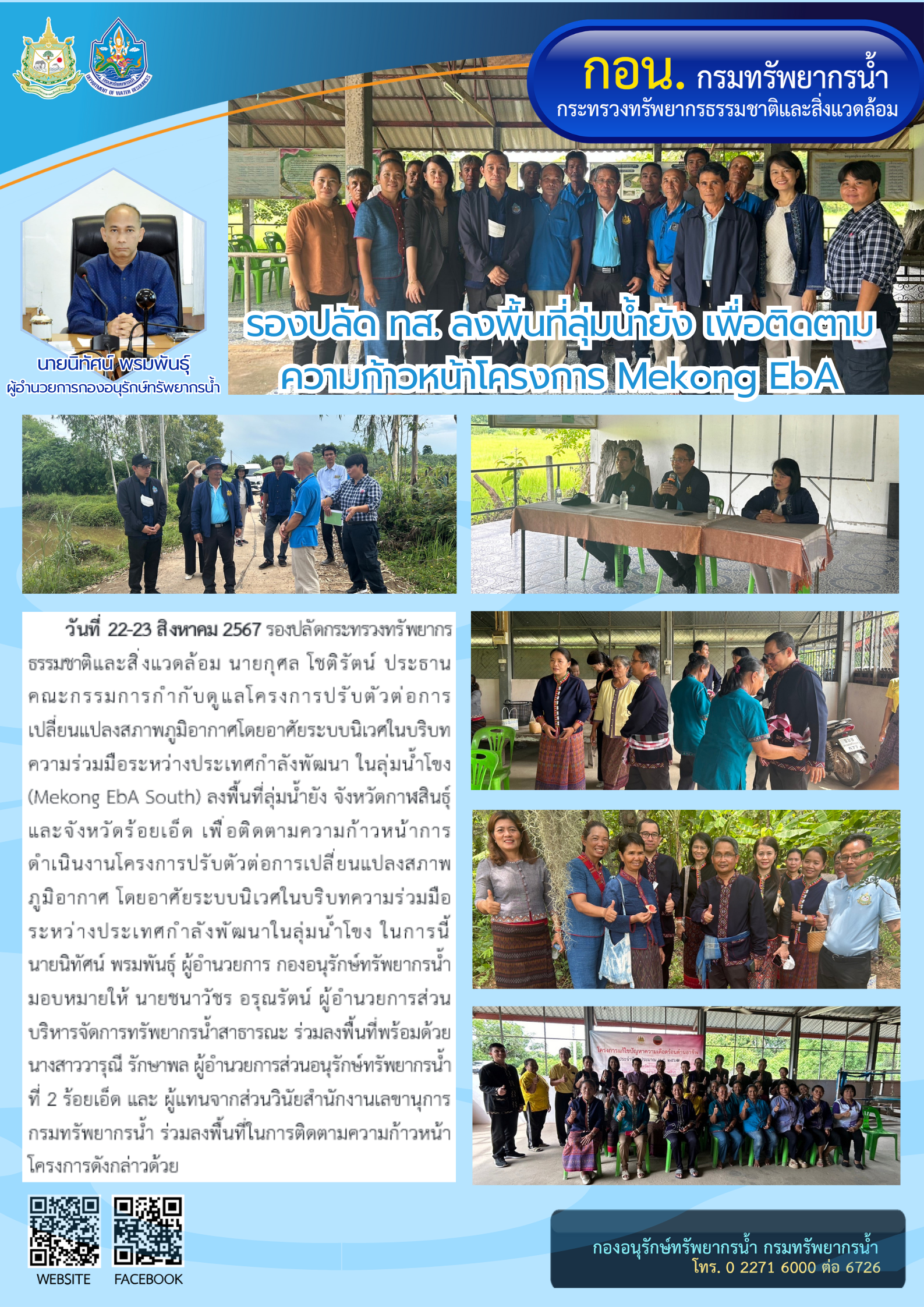 วันที่ 22 - 23 สิงหาคม 2567 รองปลัดกระทรวงทรัพยากรธรรมชาติและสิ่งแวดล้อม นายกุศล โชติรัตน์ ประธาน คณะกรรมการกำกับดูแลโครงการปรับตัวต่อการเปลี่ยนแปลงสภาพภูมิอากาศโดยอาศัยระบบนิเวศในบริบทความร่วมมือระหว่างประเทศกําลังพัฒนา ในลุ่มน้ำโขง (Mekong EbA South) ลงพื้นที่ลุ่มน้ำยัง จังหวัดกาฬสินธุ์ และจังหวัดร้อยเอ็ด เพื่อติดตามความก้าวหน้าการดําเนินงานโครงการปรับตัวต่อการเปลี่ยนแปลงสภาพภูมิอากาศ โดยอาศัยระบบนิเวศในบริบทความร่วมมือระหว่างประเทศกําลังพัฒนาในลุ่มน้ำโขง ในการนี้ นายนิทัศน์ พรมพันธุ์ ผู้อํานวยการ กองอนุรักษ์ทรัพยากรน้ำ มอบหมายให้ นายชนาวัชร อรุณรัตน์ ผู้อํานวยการส่วนบริหารจัดการทรัพยากรน้ำสาธารณะ ร่วมลงพื้นที่พร้อมด้วย นางสาววารุณี รักษาพล ผู้อํานวยการส่วนอนุรักษ์ทรัพยากรน้ำ ที่ 2 ร้อยเอ็ด และ ผู้แทนจากส่วนวินัยสำนักงานเลขานุการ กรมทรัพยากรน้ำ ร่วมลงพื้นที่ในการติดตามความก้าวหน้าโครงการดังกล่าวด้วย