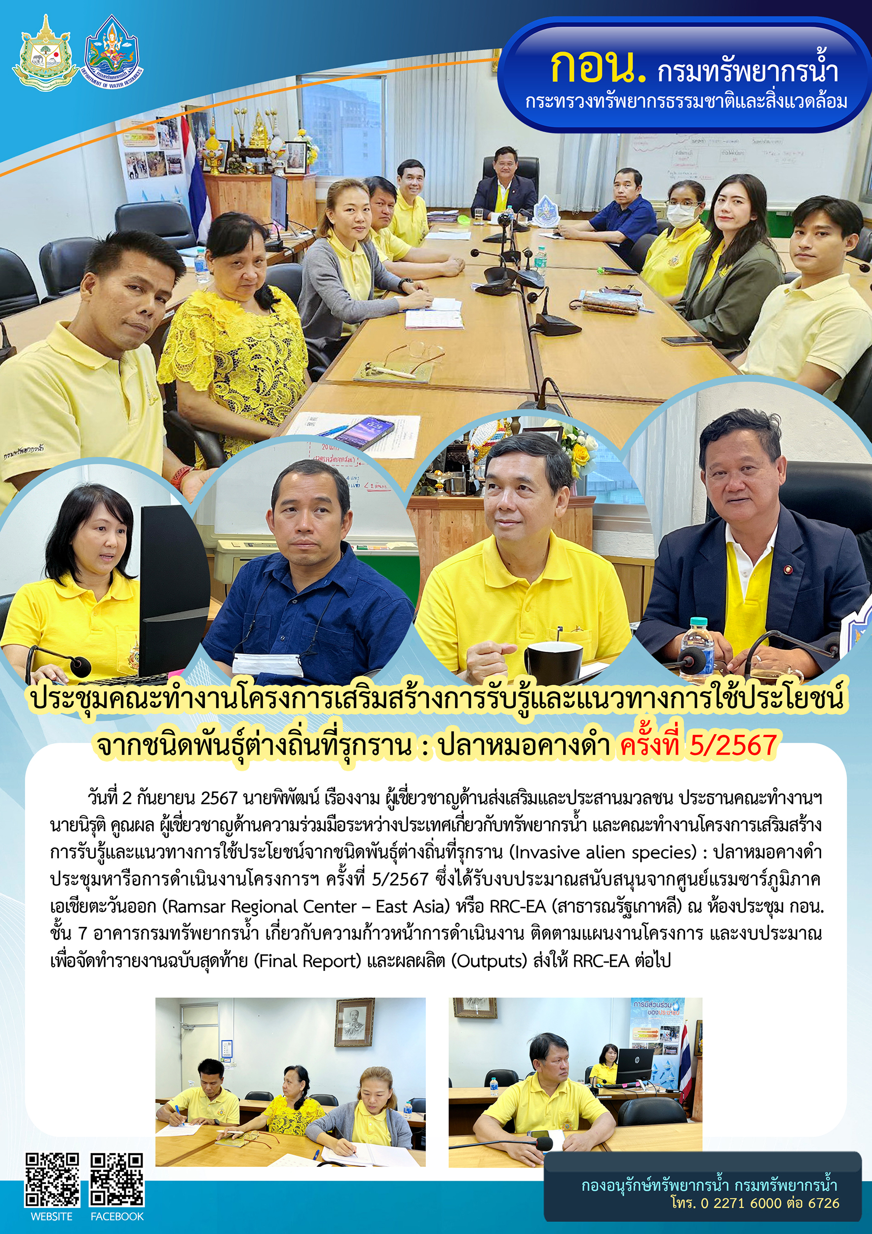 วันที่ 2 กันยายน 2567 นายพิพัฒน์ เรืองงาม ผู้เชี่ยวชาญด้านส่งเสริมและประสานมวลชน ประธานคณะทำงานฯ นายนิรุติ คูณผล ผู้เชี่ยวชาญด้านความร่วมมือระหว่างประเทศเกี่ยวกับทรัพยากรน้ำ และคณะทำงานโครงการเสริมสร้างการรับรู้และแนวทางการใช้ประโยชน์จากชนิดพันธุ์ต่างถิ่นที่รุกราน (Invasive alien species) : ปลาหมอคางดำ ประชุมหารือการดำเนินงานโครงการฯ ครั้งที่ 5/2567 ซึ่งได้รับงบประมาณสนับสนุนจากศูนย์แรมซาร์ภูมิภาคเอเชียตะวันออก (Ramsar Regional Center – East Asia) หรือ RRC-EA (สาธารณรัฐเกาหลี) ณ ห้องประชุม กอน. ชั้น 7 อาคารกรมทรัพยากรน้ำ เกี่ยวกับความก้าวหน้าการดำเนินงาน ติดตามแผนงานโครงการ และงบประมาณ เพื่อจัดทำรายงานฉบับสุดท้าย (Final Report) และผลผลิต (Outputs) ส่งให้ RRC-EA ต่อไป