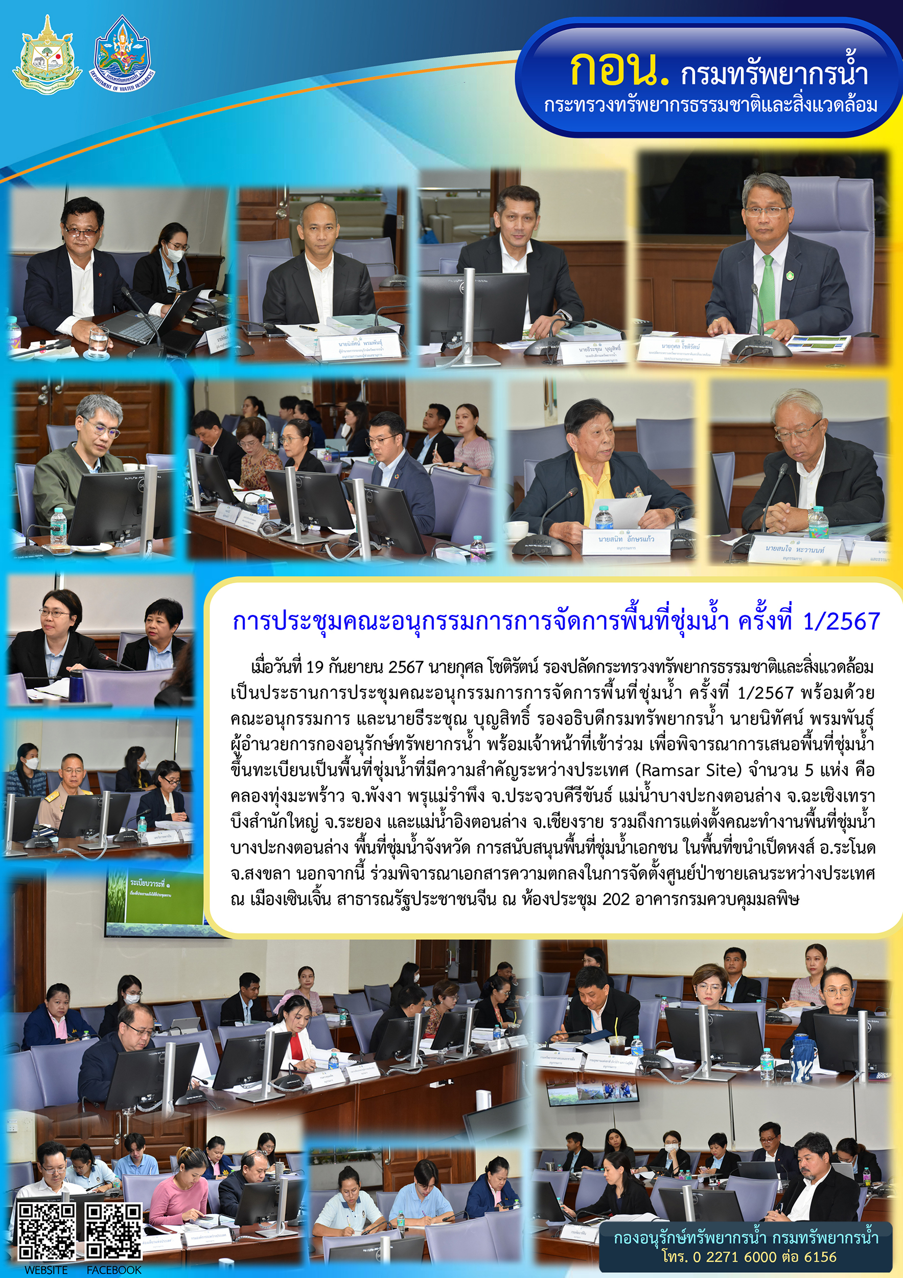 19 กันยายน 2567 นายกุศล โชติรัตน์ รองปลัดกระทรวงทรัพยากรธรรมชาติและสิ่งแวดล้อม เป็นประธานการประชุมคณะอนุกรรมการการจัดการพื้นที่ชุ่มน้ำ ครั้งที่ 1/2567 ณ ห้องประชุม 202 อาคารกรมควบคุมมลพิษ พร้อมด้วยคณะอนุกรรมการ และนายธีระชุณ บุญสิทธิ์ รองอธิบดีกรมทรัพยากรน้ำ นายนิทัศน์ พรมพันธุ์ ผู้อำนวยการกองอนุรักษ์ทรัพยากรน้ำ พร้อมเจ้าหน้าที่เข้าร่วม เพื่อพิจารณาการเสนอพื้นที่ชุ่มน้ำขึ้นทะเบียนเป็นพื้นที่ชุ่มน้ำที่มีความสำคัญระหว่างประเทศ (Ramsar Site) จำนวน 5 แห่ง รวมถึงการแต่งตั้งคณะทำงานพื้นที่ชุ่มน้ำบางปะกงตอนล่าง พื้นที่ชุ่มน้ำจังหวัด การสนับสนุนพื้นที่ชุ่มน้ำเอกชน ในพื้นที่ขนำเป็ดหงส์ อ.ระโนด จ.สงขลา นอกจากนี้ ร่วมพิจารณาเอกสารความตกลงในการจัดตั้งศูนย์ป่าชายเลนระหว่างประเทศ ณ เมืองเซินเจิ้น สาธารณรัฐประชาชนจีน