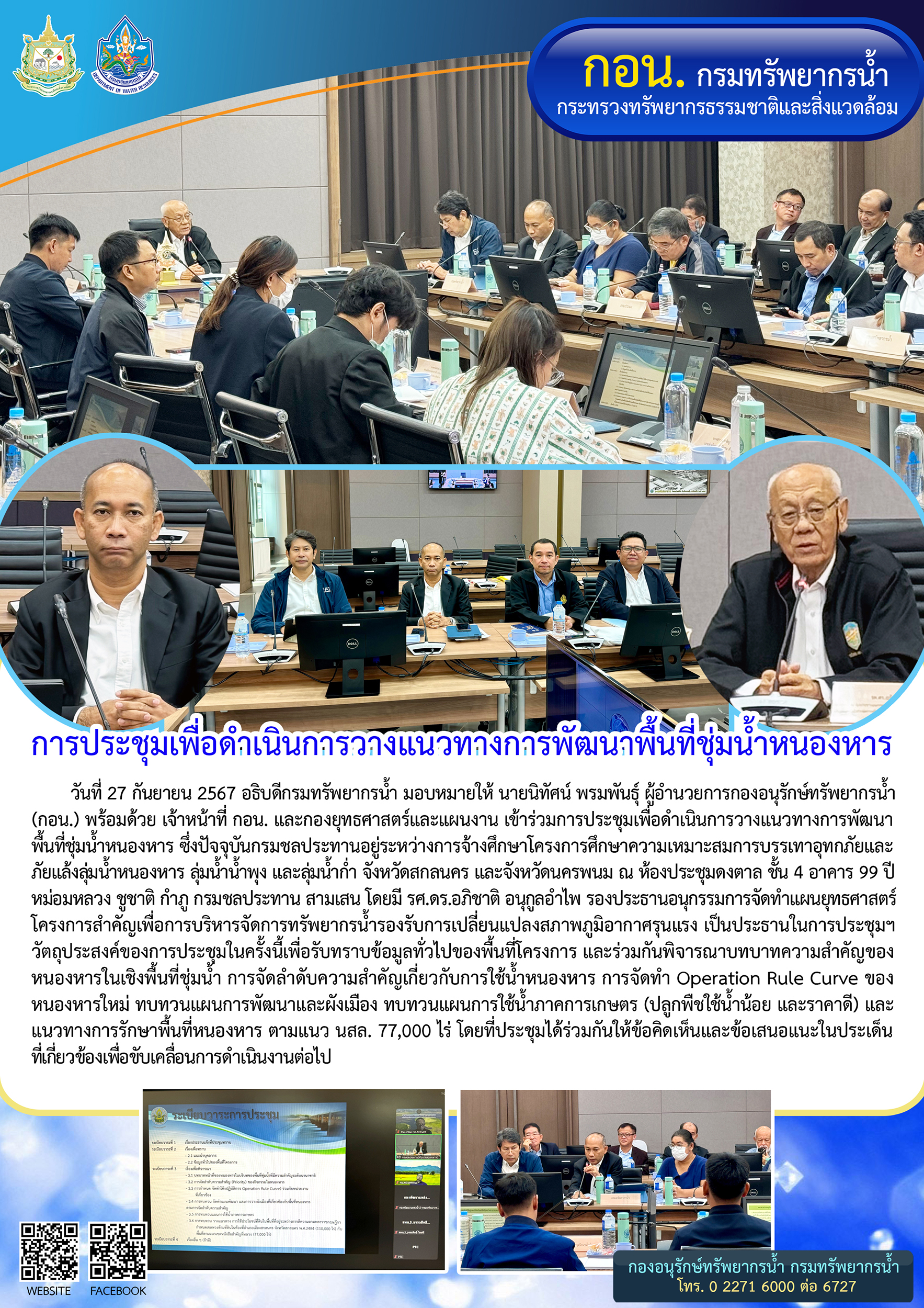 วันที่ 27 กันยายน 2567 อธิบดีกรมทรัพยากรน้ำ มอบหมายให้ นายนิทัศน์ พรมพันธุ์ ผู้อำนวยการกองอนุรักษ์ทรัพยากรน้ำ (กอน.) พร้อมด้วย เจ้าหน้าที่ กอน. และกองยุทธศาสตร์และแผนงาน เข้าร่วมการประชุมเพื่อดำเนินการวางแนวทางการพัฒนาพื้นที่ชุ่มน้ำหนองหาร ซึ่งปัจจุบันกรมชลประทานอยู่ระหว่างการจ้างศึกษาโครงการศึกษาความเหมาะสมการบรรเทาอุทกภัยและภัยแล้งลุ่มน้ำหนองหาร ลุ่มน้ำน้ำพุง และลุ่มน้ำก่ำ จังหวัดสกลนคร และจังหวัดนครพนม ณ ห้องประชุมดงตาล ชั้น 4 อาคาร 99 ปี หม่อมหลวง ชูชาติ กำภู กรมชลประทาน สามเสน โดยมี รศ.ดร.อภิชาติ อนุกูลอำไพ รองประธานอนุกรรมการจัดทำแผนยุทธศาสตร์โครงการสำคัญเพื่อการบริหารจัดการทรัพยากรน้ำรองรับการเปลี่ยนแปลงสภาพภูมิอากาศรุนแรง เป็นประธานในการประชุมฯ