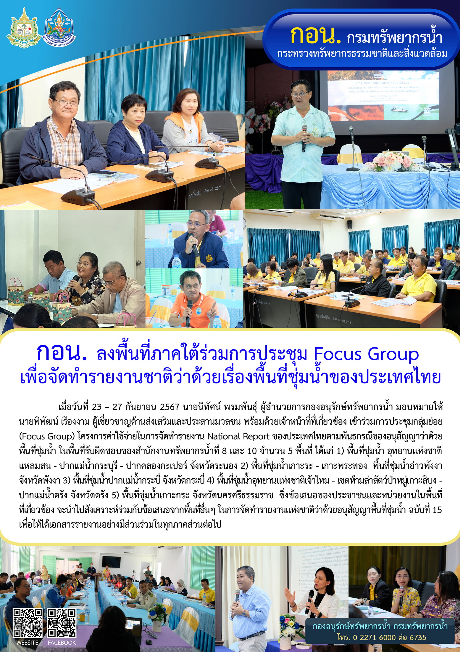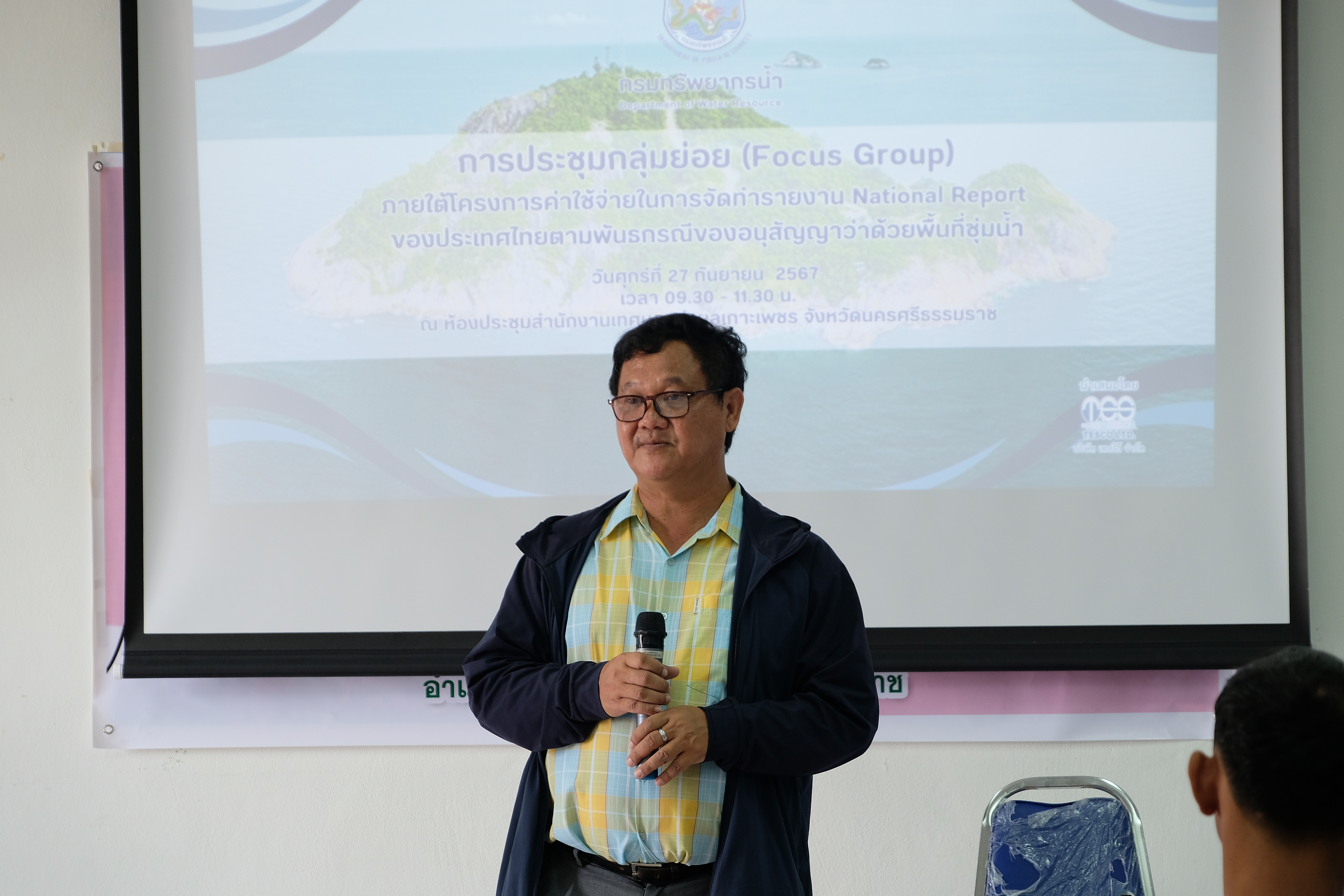 วันที่ 23 – 27 กันยายน 2567 นายนิทัศน์ พรมพันธุ์ ผู้อำนวยการกองอนุรักษ์ทรัพยากรน้ำ มอบหมายให้นายพิพัฒน์ เรืองงาม ผู้เชี่ยวชาญด้านส่งเสริมและประสานมวลชน พร้อมด้วยเจ้าหน้าที่ที่เกี่ยวข้อง เข้าร่วมการประชุมกลุ่มย่อย (Focus Group) โครงการค่าใช้จ่ายในการจัดทำรายงาน National Report ของประเทศไทยตามพันธกรณีของอนุสัญญาว่าด้วยพื้นที่ชุ่มน้ำ ในพื้นที่รับผิดชอบของสำนักงานทรัพยากรน้ำที่ 8 และ 10 จำนวน 5 พื้นที่ ได้แก่ 1) พื้นที่ชุ่มน้ำ อุทยานแห่งชาติแหลมสน - ปากแม่น้ำกระบุรี - ปากคลองกะเปอร์ จังหวัดระนอง 2) พื้นที่ชุ่มน้ำเกาะระ - เกาะพระทอง พื้นที่ชุ่มน้ำอ่าวพังงา จังหวัดพังงา 3) พื้นที่ชุ่มน้ำปากแม่น้ำกระบี่ จังหวัดกระบี่ 4) พื้นที่ชุ่มน้ำอุทยานแห่งชาติเจ้าไหม - เขตห้ามล่าสัตว์ป่าหมู่เกาะลิบง - ปากแม่น้ำตรัง จังหวัดตรัง 5) พื้นที่ชุ่มน้ำเกาะกระ จังหวัดนครศรีธรรมราช