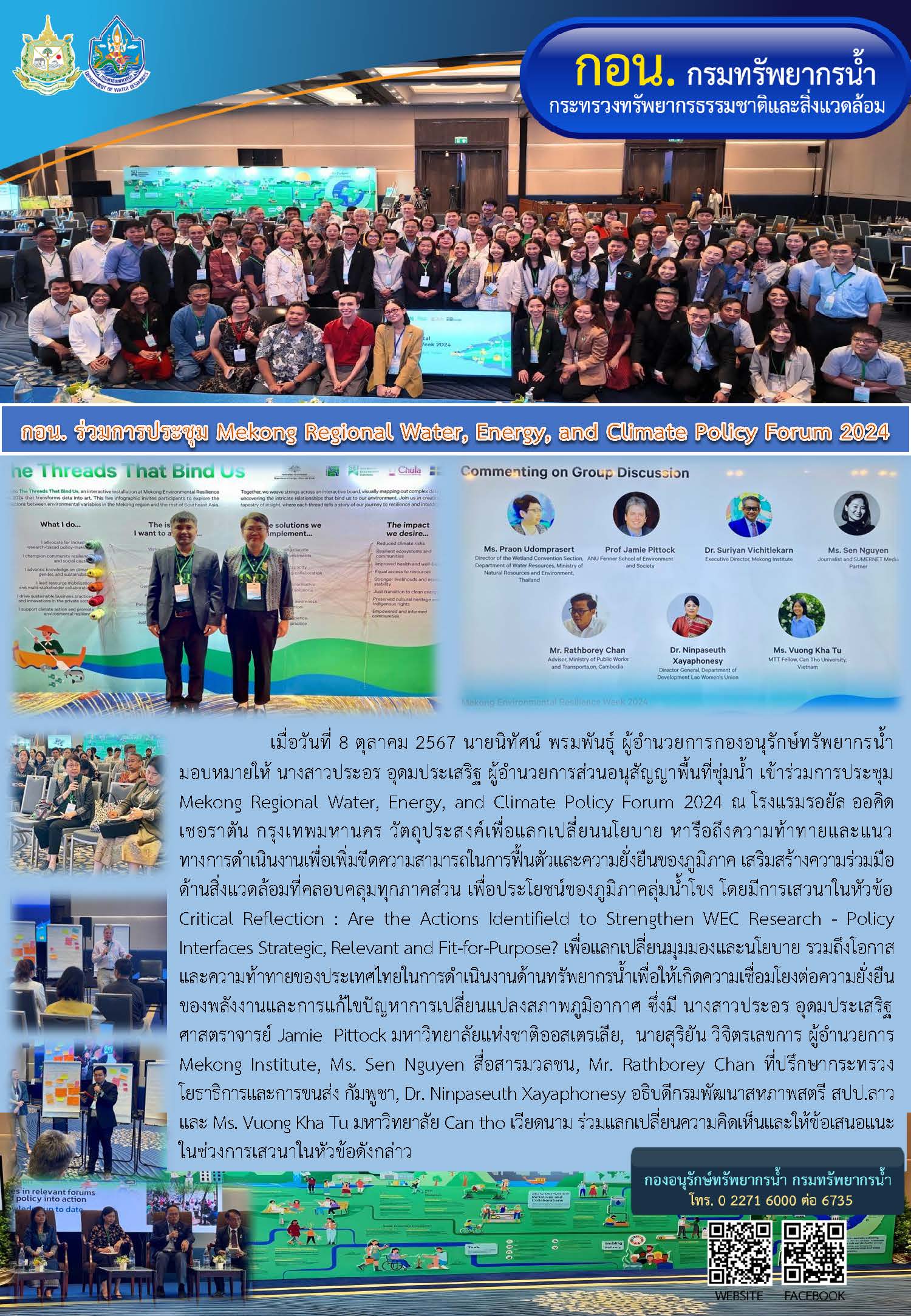 เมื่อวันที่ 8 ตุลาคม 2567 นายนิทัศน์ พรมพันธุ์ ผู้อำนวยการกองอนุรักษ์ทรัพยากรน้ำ มอบหมายให้ นางสาวประอร อุดมประเสริฐ ผู้อำนวยการส่วนอนุสัญญาพื้นที่ชุ่มน้ำ เข้าร่วมการประชุม Mekong Regional Water, Energy, and Climate Policy Forum 2024 ณ โรงแรมรอยัล ออคิด เชอราตัน กรุงเทพมหานคร วัตถุประสงค์เพื่อแลกเปลี่ยนนโยบาย หารือถึงความท้าทายและแนวทางการดำเนินงานเพื่อเพิ่มขีดความสามารถในการฟื้นตัวและความยั่งยืนของภูมิภาค เสริมสร้างความร่วมมือด้านสิ่งแวดล้อมที่คลอบคลุมทุกภาคส่วน เพื่อประโยชน์ของภูมิภาคลุ่มน้ำโขง