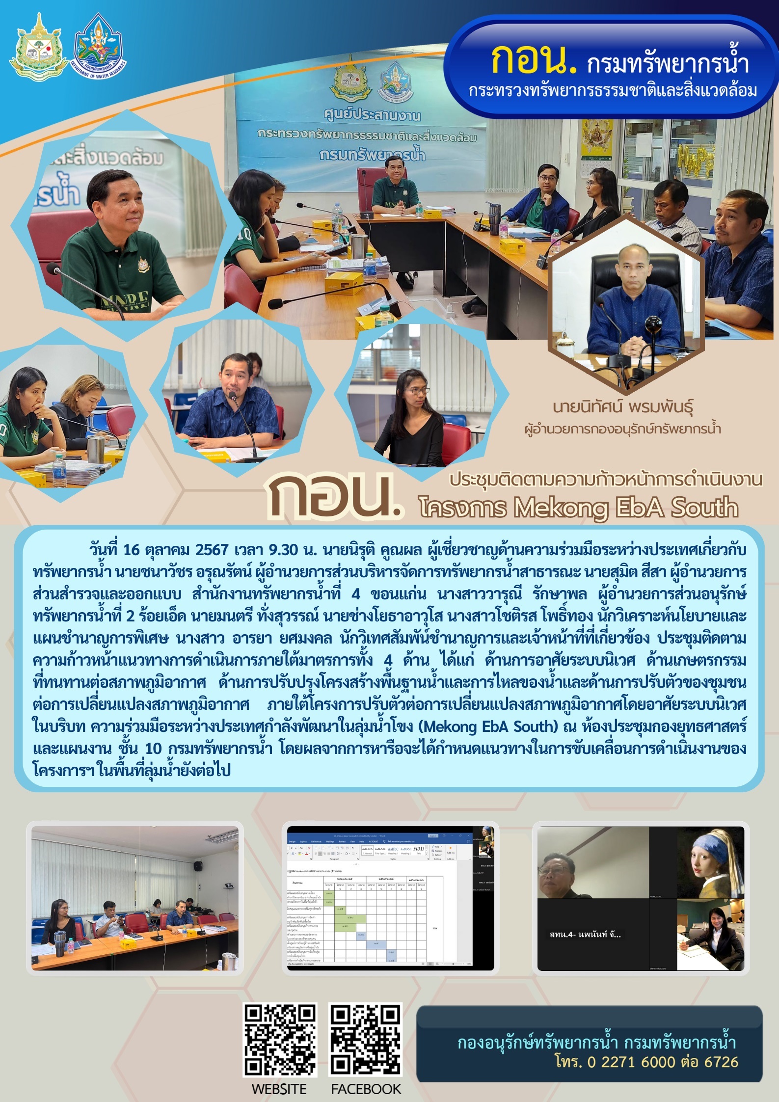 วันที่ 16 ตุลาคม 2567 เวลา 9.30 น. นายนิรุติ คูณผล ผู้เชี่ยวชาญด้านความร่วมมือระหว่างประเทศเกี่ยวกับทรัพยากรน้ำ นายชนาวัชร อรุณรัตน์ ผู้อำนวยการส่วนบริหารจัดการทรัพยากรน้ำสาธารณะ นายสุมิต สีสา ผู้อำนวยการส่วนสำรวจและออกแบบ สำนักงานทรัพยากรน้ำที่ 4 ขอนแก่น นางสาววารุณี รักษาพล ผู้อำนวยการส่วนอนุรักษ์ทรัพยากรน้ำที่ 2 ร้อยเอ็ด นายมนตรี ทั่งสุวรรณ์ นายช่างโยธาอาวุโส นางสาวโชติรส โพธิ์ทอง นักวิเคราะห์นโยบายและแผนชำนาญการพิเศษ นางสาว อารยา ยศมงคล นักวิเทศสัมพัน์ชำนาญการและเจ้าหน้าที่ที่เกี่ยวข้อง ประชุมติดตามความก้าวหน้าแนวทางการดำเนินการภายใต้มาตรการทั้ง 4 ด้าน ได้แก่ ด้านการอาศัยระบบนิเวศ ด้านเกษตรกรรมทนทานต่อสภาพภูมิอากาศ ด้านการปรับปรุงโครงสร้างพื้นฐานน้ำและการไหลของน้ำ และด้านการปรับตัวของชุมชนต่อการเปลี่ยนแปลงสภาพภูมิอากาศ ภายใต้โครงการปรับตัวต่อการเปลี่ยนแปลงสภาพภูมิอากาศ โดยอาศัยระบบนิเวศในบริบทความร่วมมือระหว่างประเทศกำลังพัฒนา ในลุ่มน้ำโขง (Mekong EbA South) ณ ห้องประชุมกองยุทธศาสตร์และแผนงาน ชั้น 10 กรมทรัพยากรน้ำ โดยผลจากการหารือจะได้กำหนดแนวทางในการขับเคลื่อน การดำเนินงานของโครงการฯ ในพื้นที่ลุ่มน้ำยังต่อไป