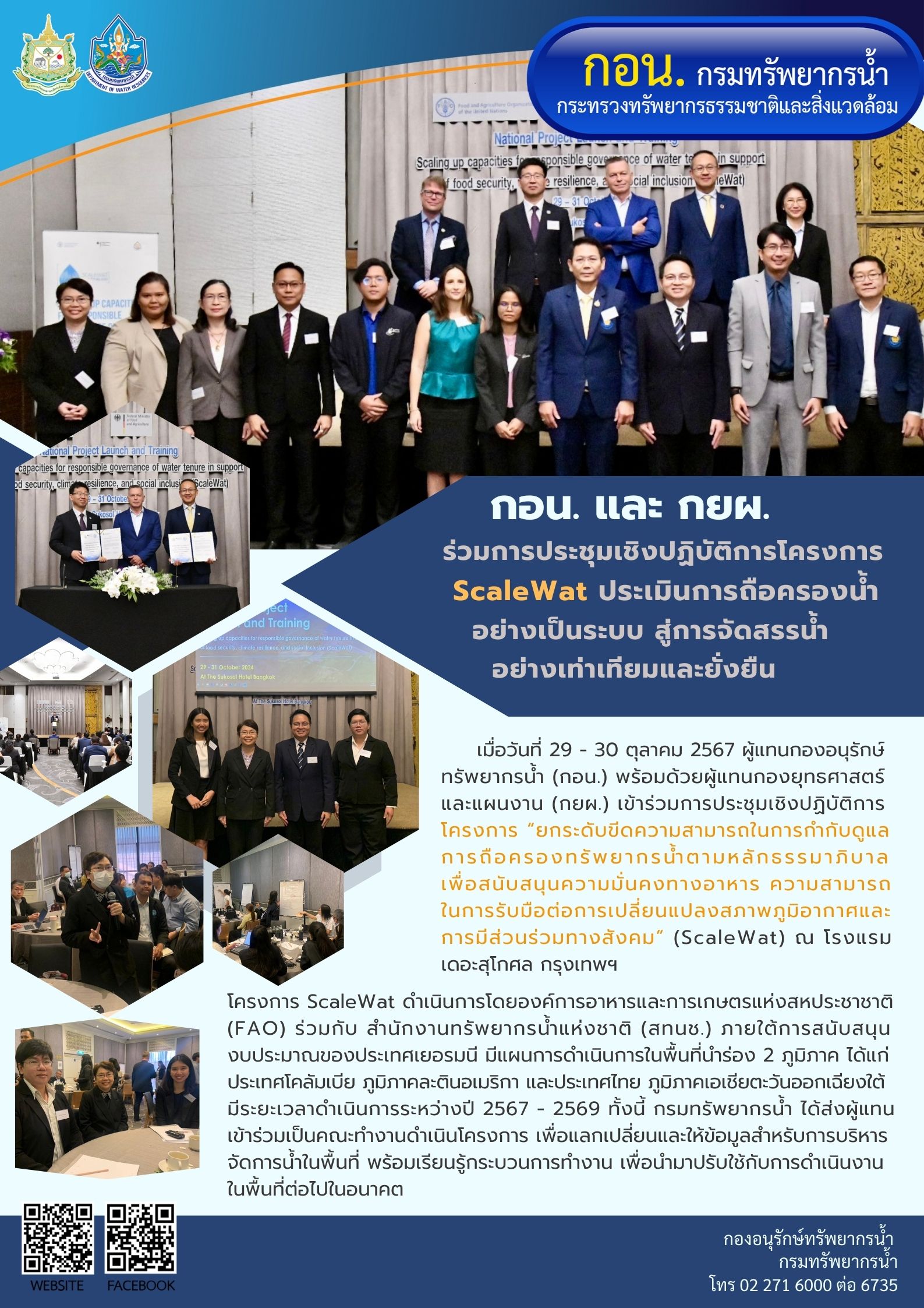 และแผนงาน (กยผ.) เข้าร่วมการประชุมเชิงปฏิบัติการโครงการ“ยกระดับขีดความสามารถในการกำกับดูแล การถือครองทรัพยากรน้ำตามหลักธรรมาภิบาล เพื่อสนับสนุนความมั่นคงทางอาหาร ความสามารถในการรับมือต่อการเปลี่ยนแปลงสภาพภูมิอากาศและการมีส่วนร่วมทางสังคม” (ScaleWat) ณ โรงแรม เดอะ สุโกศล กรุงเทพฯ