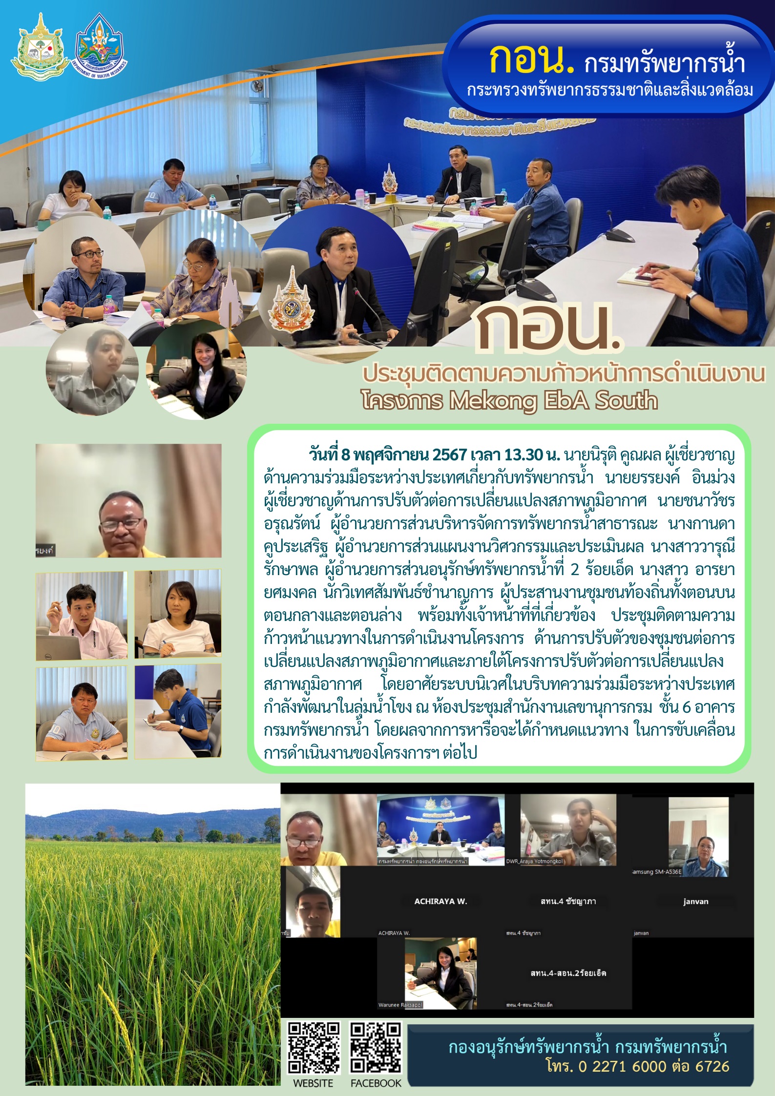 วันที่ 8 พฤศจิกายน 2567 เวลา 13.30 น. นายนิรุติ คูณผล ผู้เชี่ยวชาญด้านความร่วมมือระหว่างประเทศเกี่ยวกับทรัพยากรน้ำ นายยรรยงค์ อินม่วง ผู้เชี่ยวชาญด้านการปรับตัวต่อการเปลี่ยนแปลงสภาพภูมิอากาศ นายชนาวัชร อรุณรัตน์ ผู้อำนวยการส่วนบริหารจัดการทรัพยากรน้ำสาธารณะ นางกานดา คูประเสริฐ ผู้อำนวยการส่วนแผนงานวิศวกรรมและประเมินผล นางสาววารุณี รักษาพล ผู้อำนวยการส่วนอนุรักษ์ทรัพยากรน้ำที่ 2 ร้อยเอ็ด นางสาว อารยา ยศมงคล นักวิเทศสัมพันธ์ชำนาญการ ผู้ประสานงานชุมชนท้องถิ่นทั้งตอนบน ตอนกลางและตอนล่าง พร้อมทั้งเจ้าหน้าที่ที่เกี่ยวข้อง