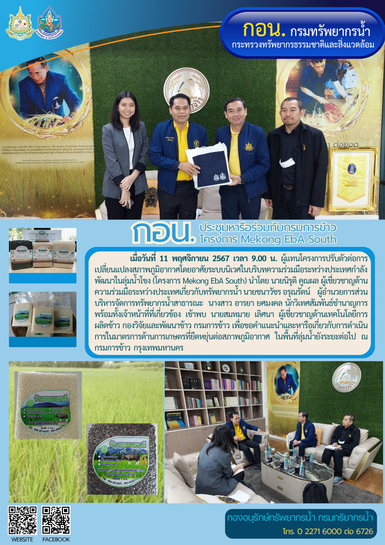 เมื่อวันที่ 11 พฤศจิกายน 2567 เวลา 9.00 น. ผู้แทนโครงการปรับตัวต่อการเปลี่ยนแปลงสภาพภูมิอากาศโดยอาศัยระบบนิเวศในบริบทความร่วมมือระหว่างประเทศกำลังพัฒนาในลุ่มน้ำโขง (โครงการ Mekong EbA South) นำโดย นายนิรุติ คูณผล ผู้เชี่ยวชาญด้านความร่วมมือระหว่างประเทศเกี่ยวกับทรัพยากรน้ำ นายชนาวัชร อรุณรัตน์ ผู้อำนวยการส่วนบริหารจัดการทรัพยากรน้ำสาธารณะ นางสาว อารยา ยศมงคล นักวิเทศสัมพันธ์ชำนาญการ พร้อมทั้งเจ้าหน้าที่ที่เกี่ยวข้อง เข้าพบ นายสมหมาย เลิศนา ผู้เชี่ยวชาญด้านเทคโนโลยีการผลิตข้าว กองวิจัยและพัฒนาข้าว กรมการข้าว เพื่อขอคำแนะนำและหารือเกี่ยวกับการดำเนินการในมาตรการด้านการเกษตรที่ยืดหยุ่นต่อสภาพภูมิอากาศ ในพื้นที่ลุ่มน้ำยังระยะต่อไป ณ กรมการข้าว กรุงเทพมหานคร