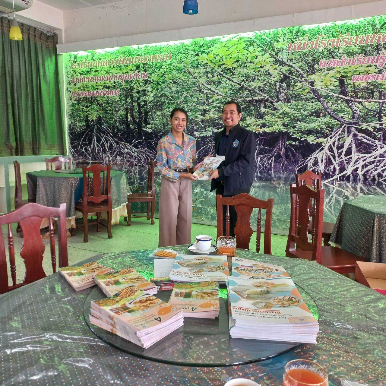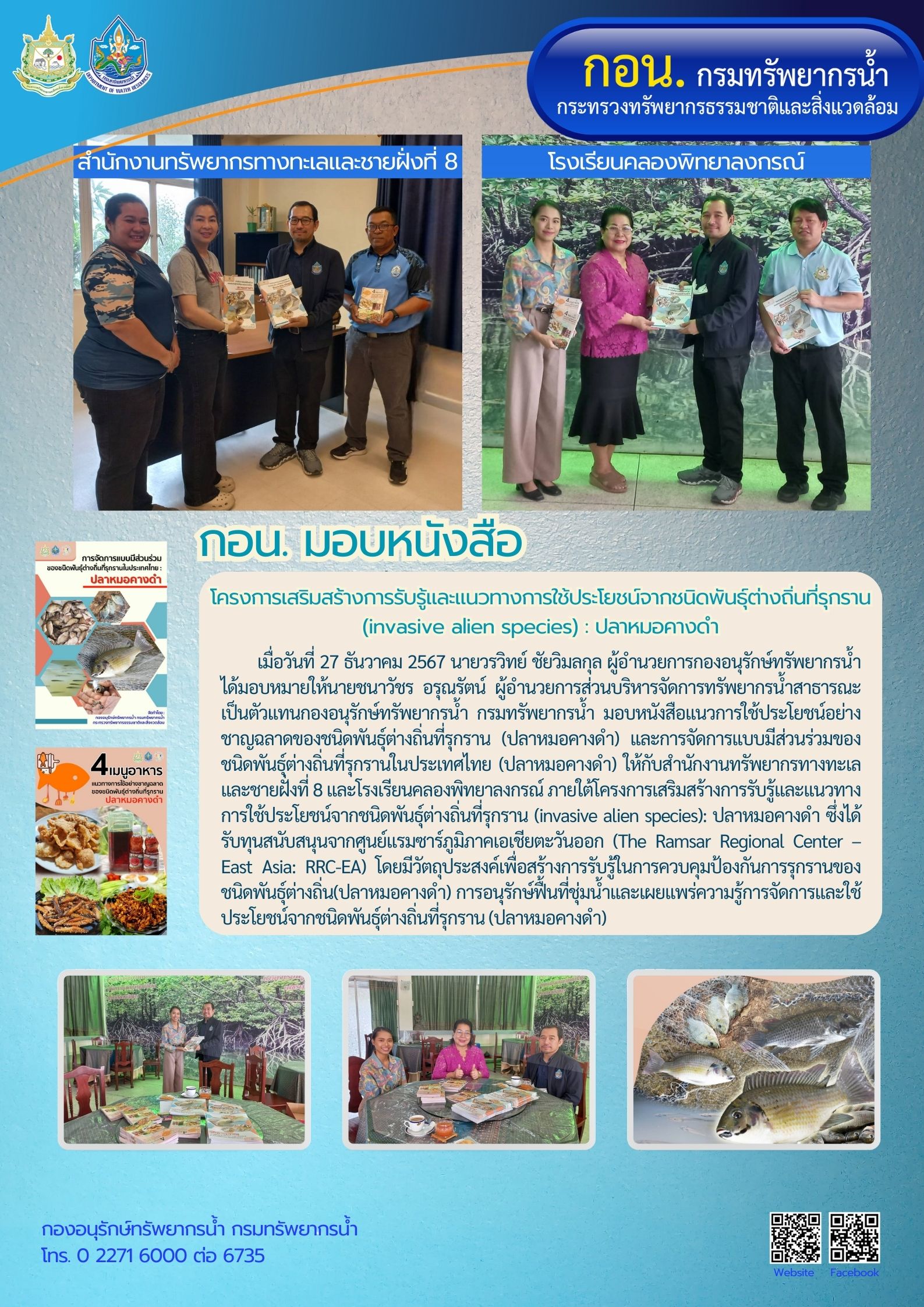 เมื่อวันที่ 27 ธันวาคม 2567 นายวรวิทย์ ชัยวิมลกุล ผู้อำนวยการกองอนุรักษ์ทรัพยากรน้ำ ได้มอบหมายให้นายชนาวัชร อรุณรัตน์ ผู้อำนวยการส่วนบริหารจัดการทรัพยากรน้ำสาธารณะ เป็นตัวแทนกองอนุรักษ์ทรัพยากรน้ำ กรมทรัพยากรน้ำ มอบหนังสือแนวการใช้ประโยชน์อย่างชาญฉลาดของชนิดพันธุ์ต่างถิ่นที่รุกราน (ปลาหมอคางดำ) และการจัดการแบบมีส่วนร่วมของชนิดพันธุ์ต่างถิ่นที่รุกรานในประเทศไทย (ปลาหมอคางดำ) ให้กับสำนักงานทรัพยากรทางทะเลและชายฝั่งที่ 8 และโรงเรียนคลองพิทยาลงกรณ์ ภายใต้โครงการเสริมสร้างการรับรู้และแนวทางการใช้ประโยชน์จากชนิดพันธุ์ต่างถิ่นที่รุกราน (invasive alien species): ปลาหมอคางดำ