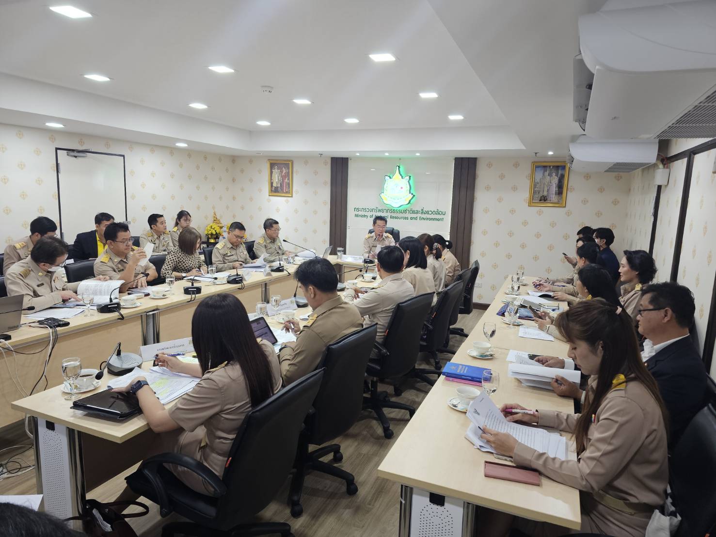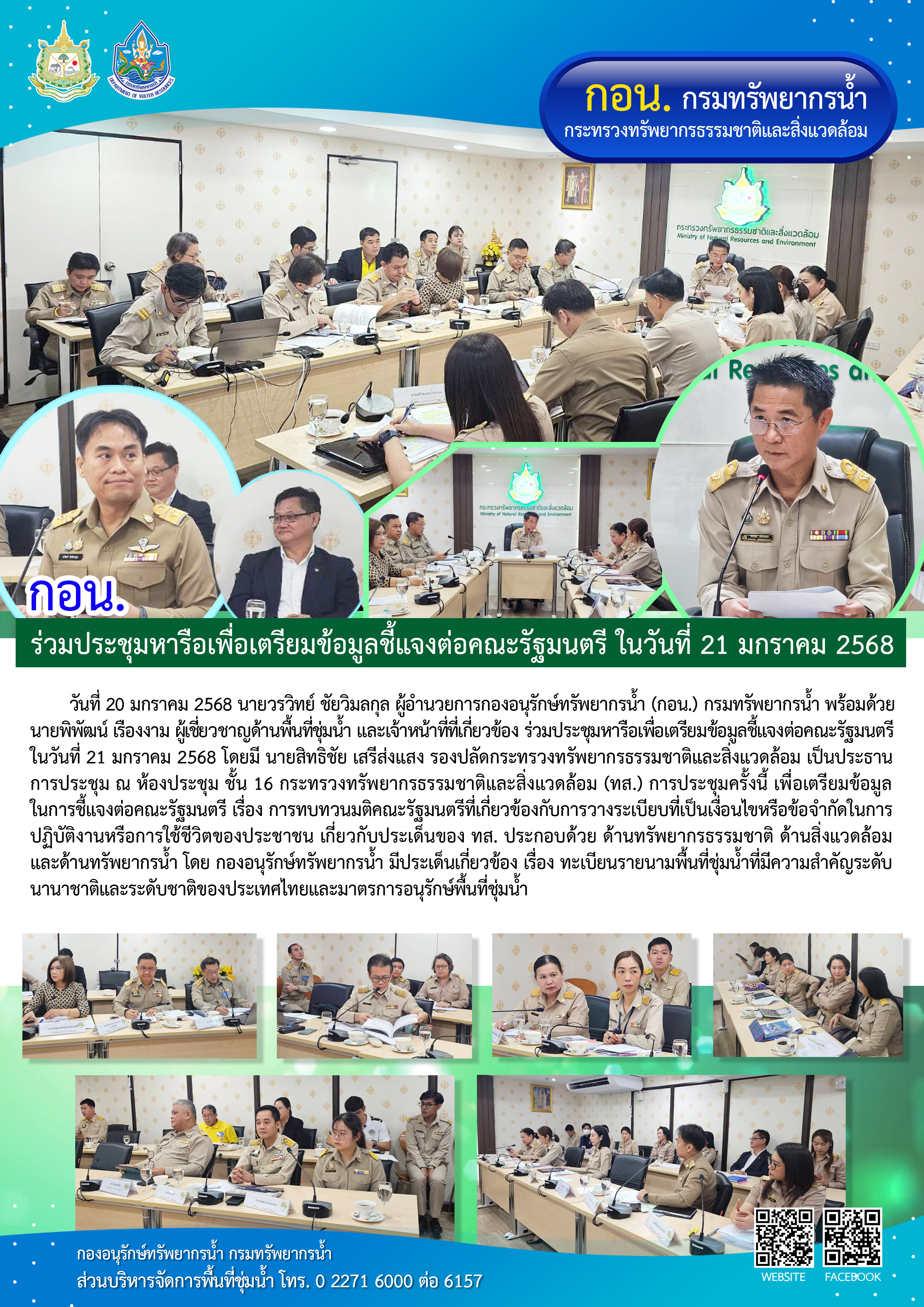 วันที่ 20 มกราคม 2568 นายวรวิทย์ ชัยวิมลกุล ผู้อำนวยการกองอนุรักษ์ทรัพยากรน้ำ (กอน.) กรมทรัพยากรน้ำ พร้อมด้วย นายพิพัฒน์ เรืองงาม ผู้เชี่ยวชาญด้านพื้นที่ชุ่มน้ำ และเจ้าหน้าที่ที่เกี่ยวข้อง ร่วมประชุมหารือเพื่อเตรียมข้อมูลชี้แจงต่อคณะรัฐมนตรี ในวันที่ 21 มกราคม 2568 โดยมี นายสิทธิชัย เสรีส่งแสง รองปลัดกระทรวงทรัพยากรธรรมชาติและสิ่งแวดล้อม เป็นประธานการประชุม ณ ห้องประชุม ชั้น 16 กระทรวงทรัพยากรธรรมชาติและสิ่งแวดล้อม (ทส.) การประชุมครั้งนี้ เพื่อเตรียมข้อมูลในการชี้แจงต่อคณะรัฐมนตรี เรื่อง การทบทวนมติคณะรัฐมนตรีที่เกี่ยวข้องกับการวางระเบียบที่เป็นเงื่อนไขหรือข้อจำกัดในการปฏิบัติงานหรือการใช้ชีวิตของประชาชน เกี่ยวกับประเด็นของ ทส. ประกอบด้วย ด้านทรัพยากรธรรมชาติ ด้านสิ่งแวดล้อม และด้านทรัพยากรน้ำ โดย กองอนุรักษ์ทรัพยากรน้ำ มีประเด็นเกี่ยวข้อง เรื่อง ทะเบียนรายนามพื้นที่ชุ่มน้ำที่มีความสำคัญระดับนานาชาติและระดับชาติของประเทศไทยและมาตรการอนุรักษ์พื้นที่ชุ่มน้ำ