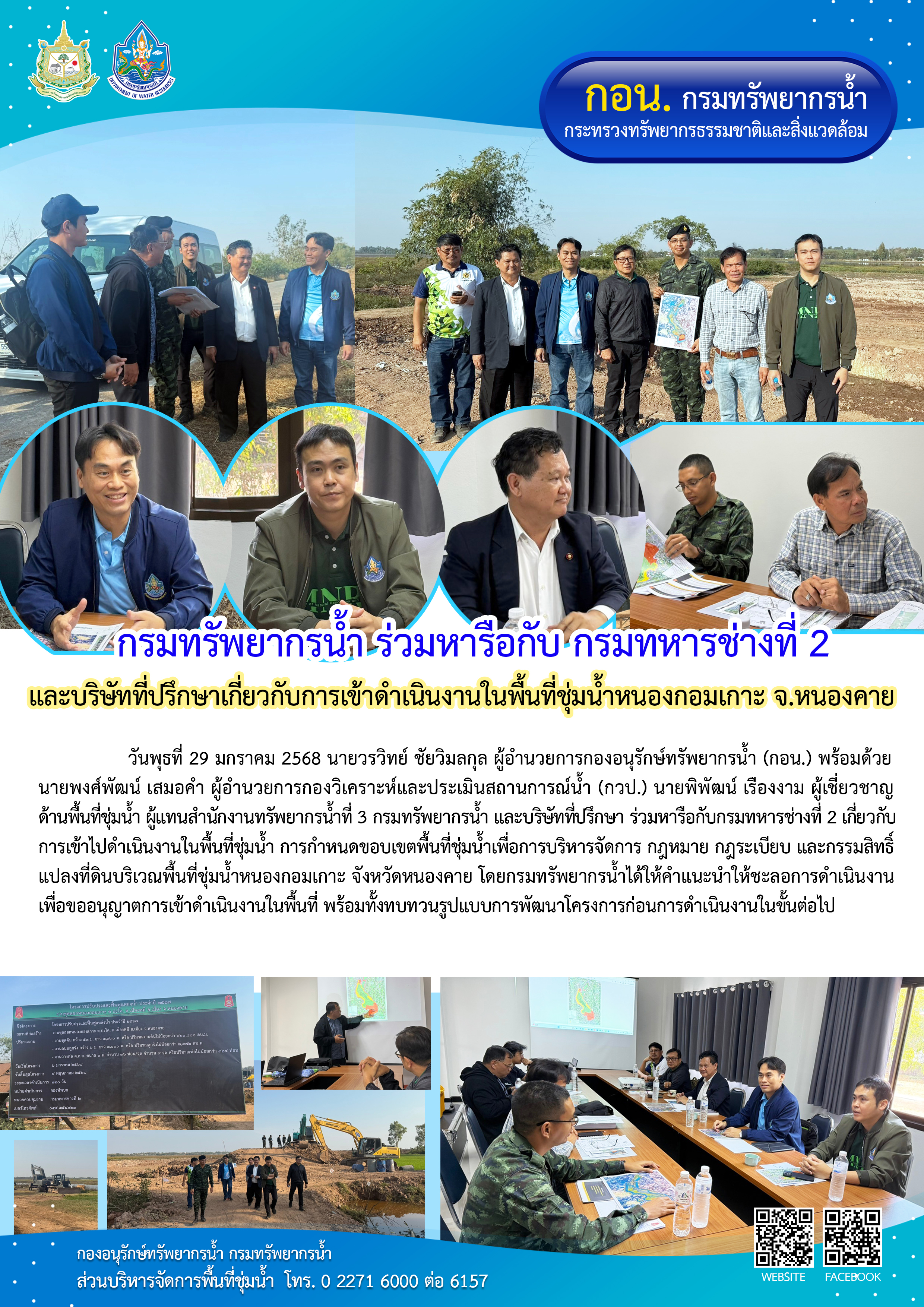 กรมทรัพยากรน้ำ ร่วมหารือกับ กรมทหารช่างที่ 2 และบริษัทที่ปรึกษา เกี่ยวกับการเข้าดำเนินงานในพื้นที่ชุ่มน้ำหนองกอมเกาะ จังหวัดหนองคาย