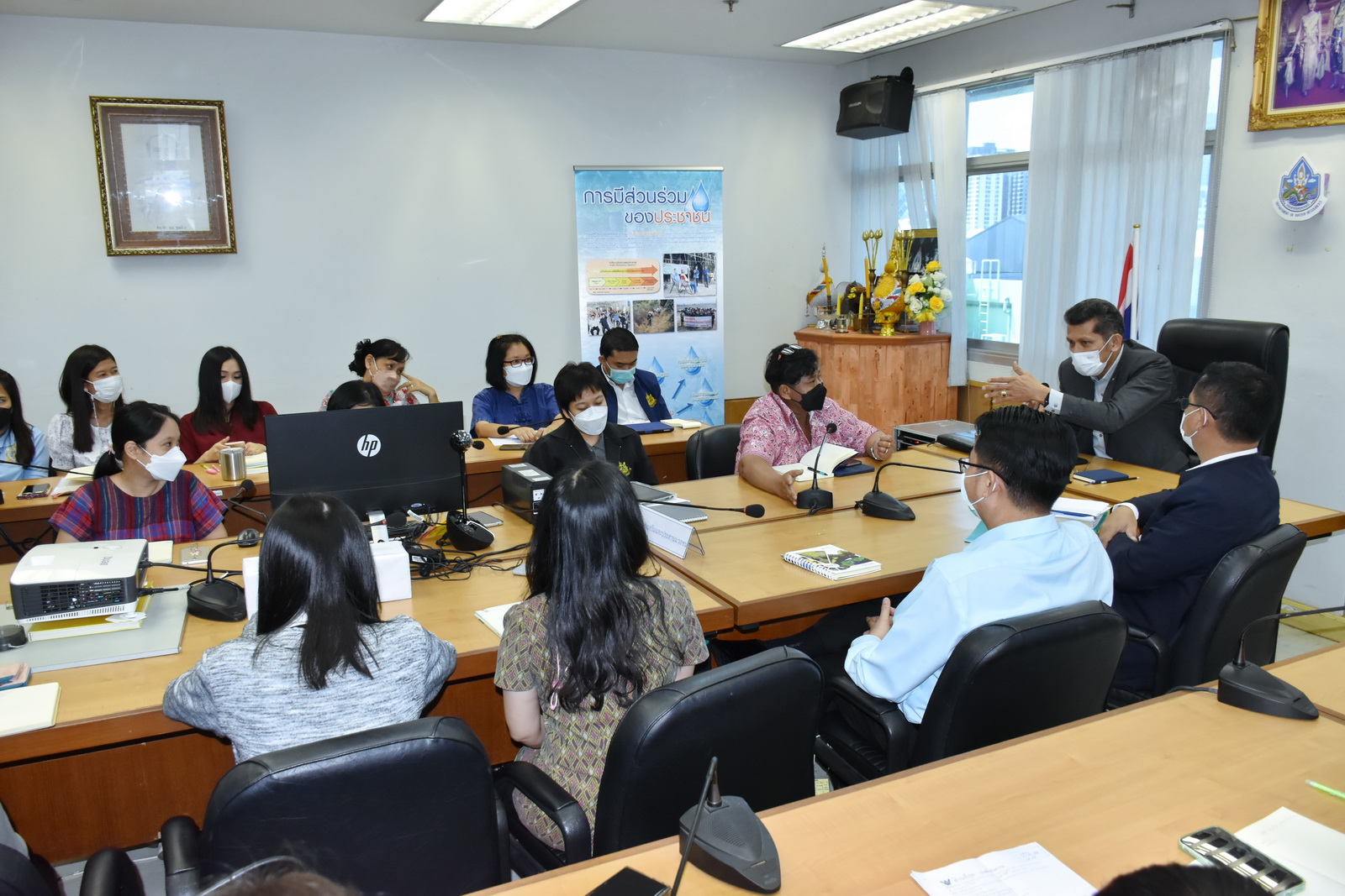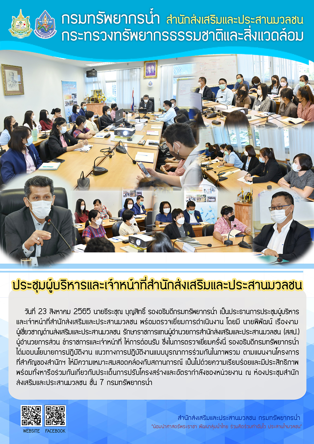 23 สิงหาคม 2565 นายธีระชุณ บุญสิทธิ์ รองอธิบดีกรมทรัพยากรน้ำ เป็นประธานการประชุมผู้บริหารและเจ้าหน้าที่สำนักส่งเสริมและประสานมวลชน พร้อมตรวจเยี่ยมการดำเนินงาน โดยมี นายพิพัฒน์ เรืองงาม ผู้เชี่ยวชาญด้านส่งเสริมและประสานมวลชน รักษาราชการแทนผู้อำนวยการสำนักส่งเสริมและประสานมวลชน (สสป.) ผู้อำนวยการส่วน ข้าราชการและเจ้าหน้าที่ ให้การต้อนรับ