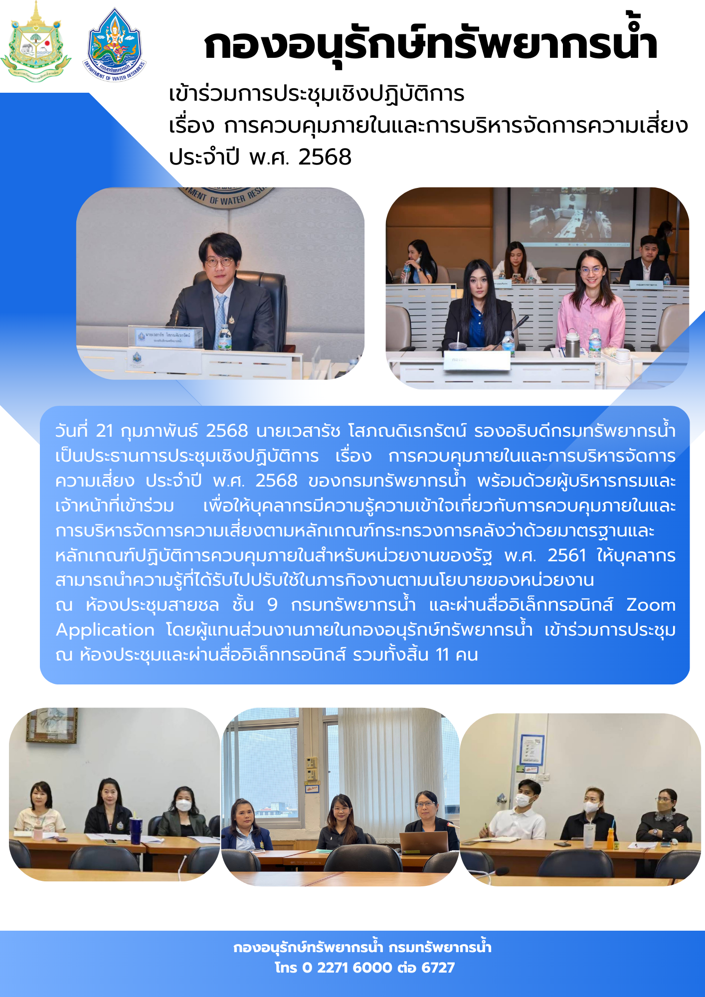 กองอนุรักษ์ทรัพยากรน้ำ เข้าร่วมการประชุมเชิงปฏิบัติการ เรื่อง การควบคุมภายในและการบริหารจัดการความเสี่ยง ประจำปี พ.ศ. 2568