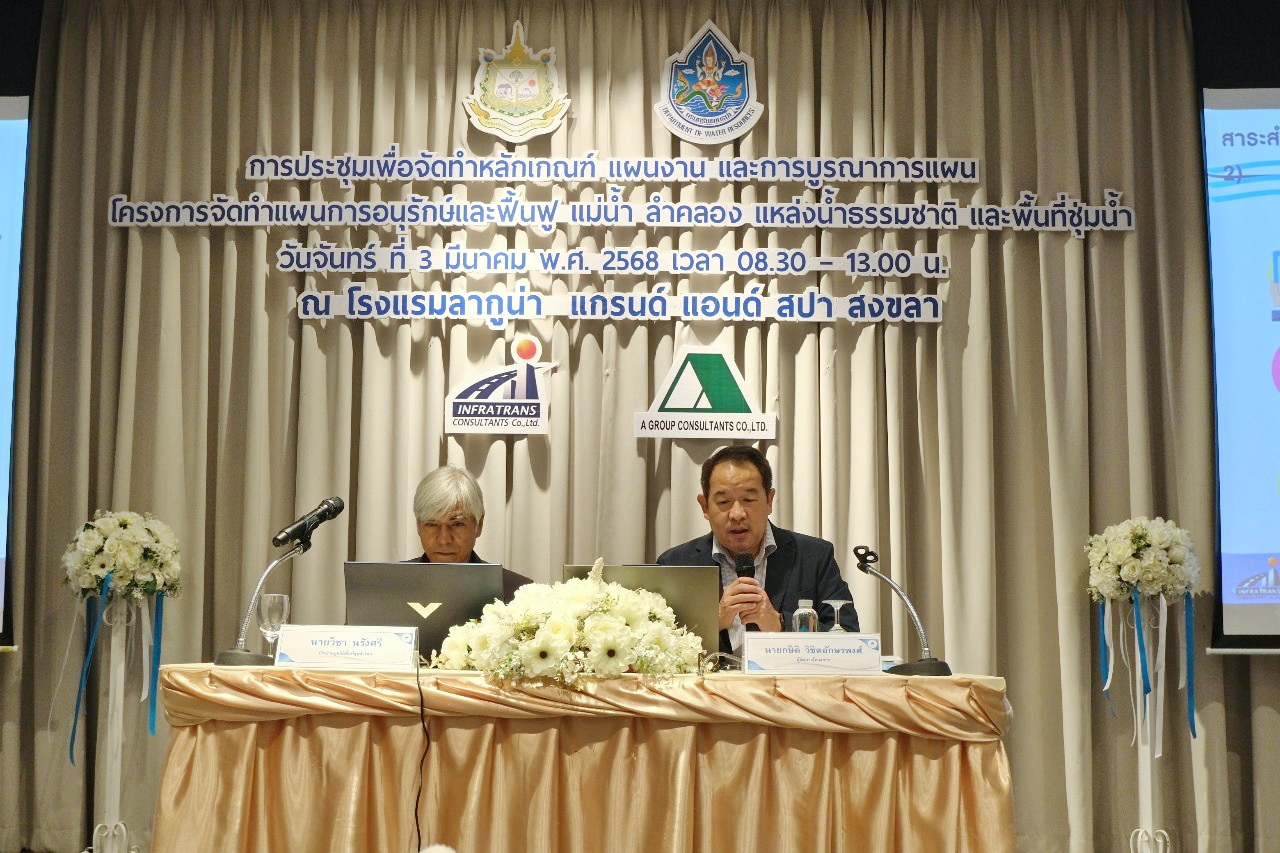 เมื่อวันที่ 3 มีนาคม 2568 นายสนใจ หะวานนท์ ประธานคณะทำงานวิชาการพื้นที่ชุ่มน้ำ พร้อมด้วย คณะทำงานวิชาการพื้นที่ชุ่มน้ำ นายวรวิทย์ ชัยวิมลกุล ผู้อำนวยการกองอนุรักษ์ทรัพยากรน้ำ นายกิตติศักดิ์ ใจดี ผู้อำนวยการสำนักงานทรัพยากรน้ำที่ 8 นายพิพัฒน์ เรืองงาม ผู้เชี่ยวชาญด้านพื้นที่ชุ่มน้ำ และเจ้าหน้าที่กรมทรัพยากรน้ำ ร่วมการประชุมโครงการค่าใช้จ่ายในการจัดทำแผนการอนุรักษ์และฟื้นฟู แม่น้ำ ลำคลอง แหล่งน้ำธรรมชาติ และพื้นที่ชุ่มน้ำ เพื่อจัดทำหลักเกณฑ์ แผนงาน และการบูรณาการแผนงานร่วมกัน โดยรับฟังความคิดเห็นของประชาชน และผู้แทนจากหน่วยงานราชการในพื้นที่ที่เกี่ยวข้อง (ภาคใต้) ณ ห้องประชุมลากูน่า ควีน ชั้น 1 โรงแรมลากูน่า แกรนด์ โฮเทล แอนด์ สปา จังหวัดสงขลา