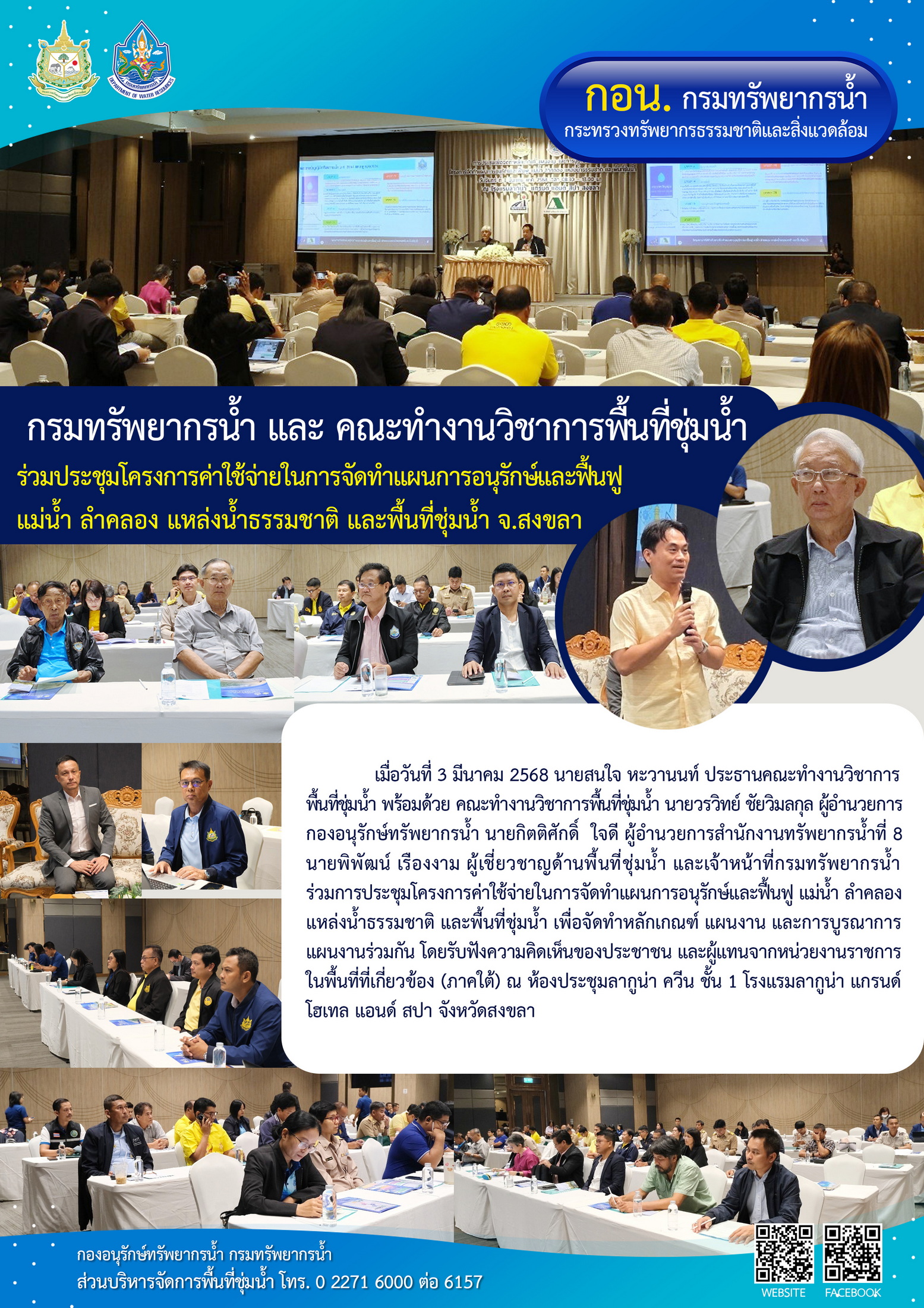 เมื่อวันที่ 3 มีนาคม 2568 นายสนใจ หะวานนท์ ประธานคณะทำงานวิชาการพื้นที่ชุ่มน้ำ พร้อมด้วย คณะทำงานวิชาการพื้นที่ชุ่มน้ำ นายวรวิทย์ ชัยวิมลกุล ผู้อำนวยการกองอนุรักษ์ทรัพยากรน้ำ นายกิตติศักดิ์ ใจดี ผู้อำนวยการสำนักงานทรัพยากรน้ำที่ 8 นายพิพัฒน์ เรืองงาม ผู้เชี่ยวชาญด้านพื้นที่ชุ่มน้ำ และเจ้าหน้าที่กรมทรัพยากรน้ำ ร่วมการประชุมโครงการค่าใช้จ่ายในการจัดทำแผนการอนุรักษ์และฟื้นฟู แม่น้ำ ลำคลอง แหล่งน้ำธรรมชาติ และพื้นที่ชุ่มน้ำ เพื่อจัดทำหลักเกณฑ์ แผนงาน และการบูรณาการแผนงานร่วมกัน โดยรับฟังความคิดเห็นของประชาชน และผู้แทนจากหน่วยงานราชการในพื้นที่ที่เกี่ยวข้อง (ภาคใต้) ณ ห้องประชุมลากูน่า ควีน ชั้น 1 โรงแรมลากูน่า แกรนด์ โฮเทล แอนด์ สปา จังหวัดสงขลา