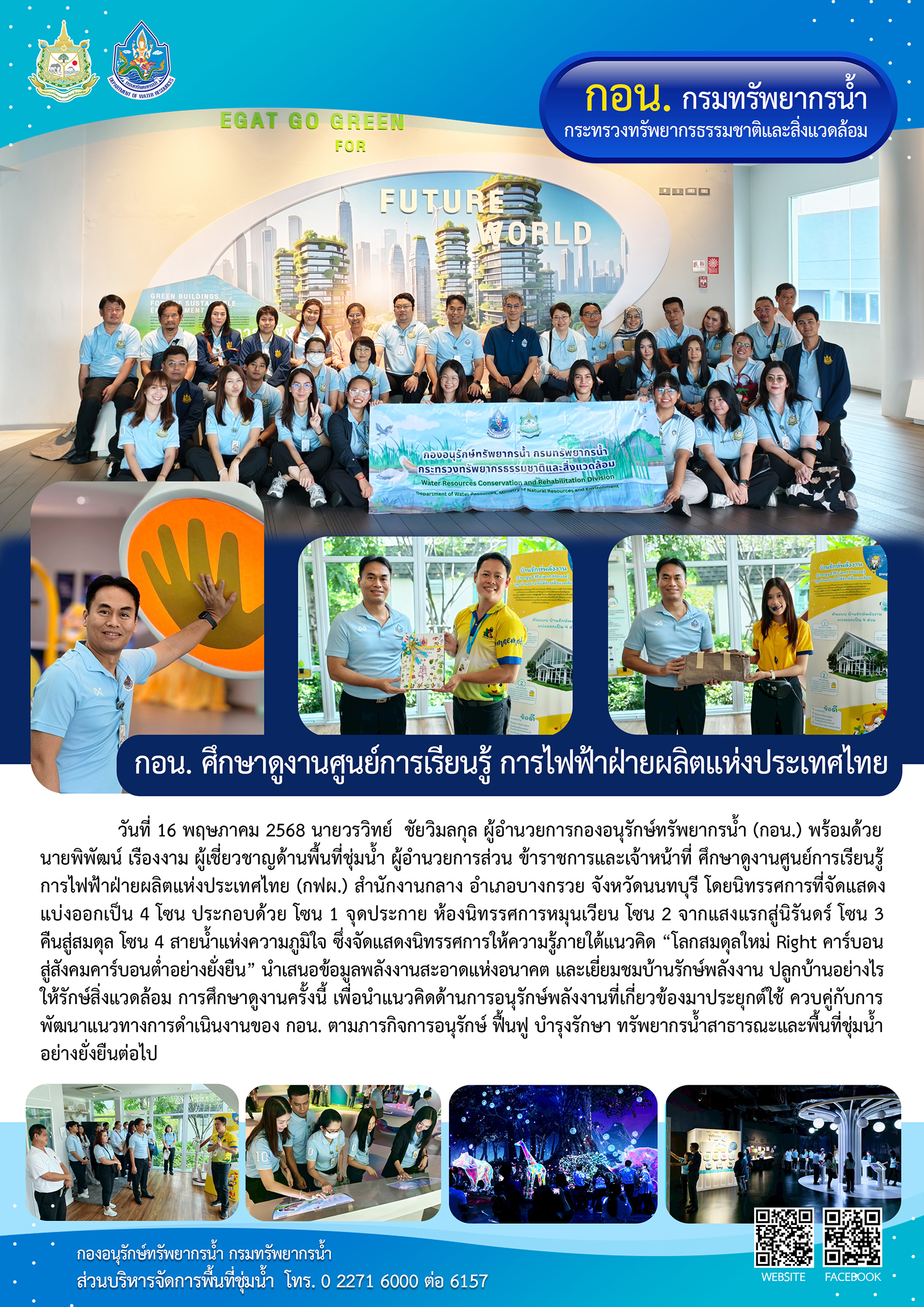 วันที่ 16 พฤษภาคม 2568 นายวรวิทย์ ชัยวิมลกุล ผู้อำนวยการกองอนุรักษ์ทรัพยากรน้ำ (กอน.) พร้อมด้วย นายพิพัฒน์ เรืองงาม ผู้เชี่ยวชาญด้านพื้นที่ชุ่มน้ำ ผู้อำนวยการส่วน ข้าราชการและเจ้าหน้าที่ ศึกษาดูงานศูนย์การเรียนรู้ การไฟฟ้าฝ่ายผลิตแห่งประเทศไทย (กฟผ.) สำนักงานกลาง อำเภอบางกรวย จังหวัดนนทบุรี โดยนิทรรศการที่จัดแสดงแบ่งออกเป็น 4 โซน ประกอบด้วย โซน 1 จุดประกาย ห้องนิทรรศการหมุนเวียน โซน 2 จากแสงแรกสู่นิรันดร์ โซน 3 คืนสู่สมดุล โซน 4 สายน้ำแห่งความภูมิใจ ซึ่งจัดแสดงนิทรรศการให้ความรู้ภายใต้แนวคิด “โลกสมดุลใหม่ Right คาร์บอน