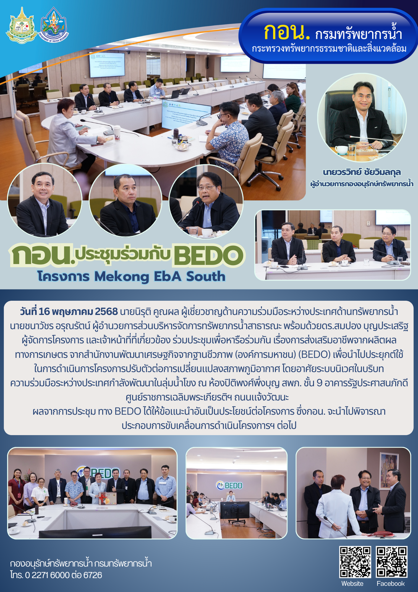 วันที่ 16 พฤษภาคม 2568 นายนิรุติ คูณผล ผู้เชี่ยวชาญด้านความร่วมมือระหว่างประเทศด้านทรัพยากรน้ำ นายชนาวัชร อรุณรัตน์ ผู้อำนวยการส่วนบริหารจัดการทรัพยากรน้ำสาธารณะ พร้อมด้วยดร.สมปอง บุญประเสริฐ ผู้จัดการโครงการ และเจ้าหน้าที่ที่เกี่ยวข้อง ร่วมประชุมเพื่อหารือร่วมกัน เรื่องการส่งเสริมอาชีพจากผลิตผลทางการเกษตร จากสำนักงานพัฒนาเศรษฐกิจจากฐานชีวภาพ (องค์การมหาชน) (BEDO) เพื่อนำไปประยุกต์ใช้ในการดำเนินการโครงการปรับตัวต่อการเปลี่ยนแปลงสภาพภูมิอากาศ โดยอาศัยระบบนิเวศในบริบทความร่วมมือระหว่างประเทศกำลังพัฒนาในลุ่มน้ำโขง ณ ห้องปิติพงศ์พึ่งบุญ สพภ. ชั้น 9 อาคารรัฐประศาสนภักดี ศูนย์ราชการเฉลิมพระเกียรติฯ ถนนแจ้งวัฒนะ ผลจากการประชุม ทาง BEDO ได้ให้ข้อแนะนำอันเป็นประโยชน์ต่อโครงการ ซึ่งกอน. จะนำไปพิจารณาประกอบการขับเคลื่อนการดำเนินโครงการฯ ต่อไป