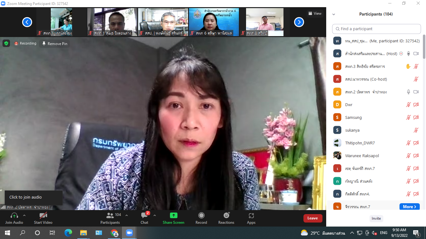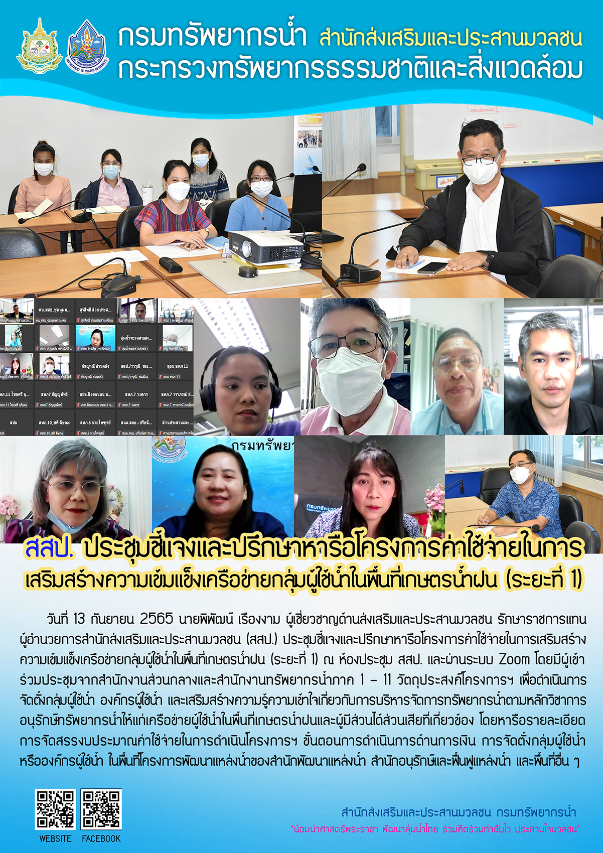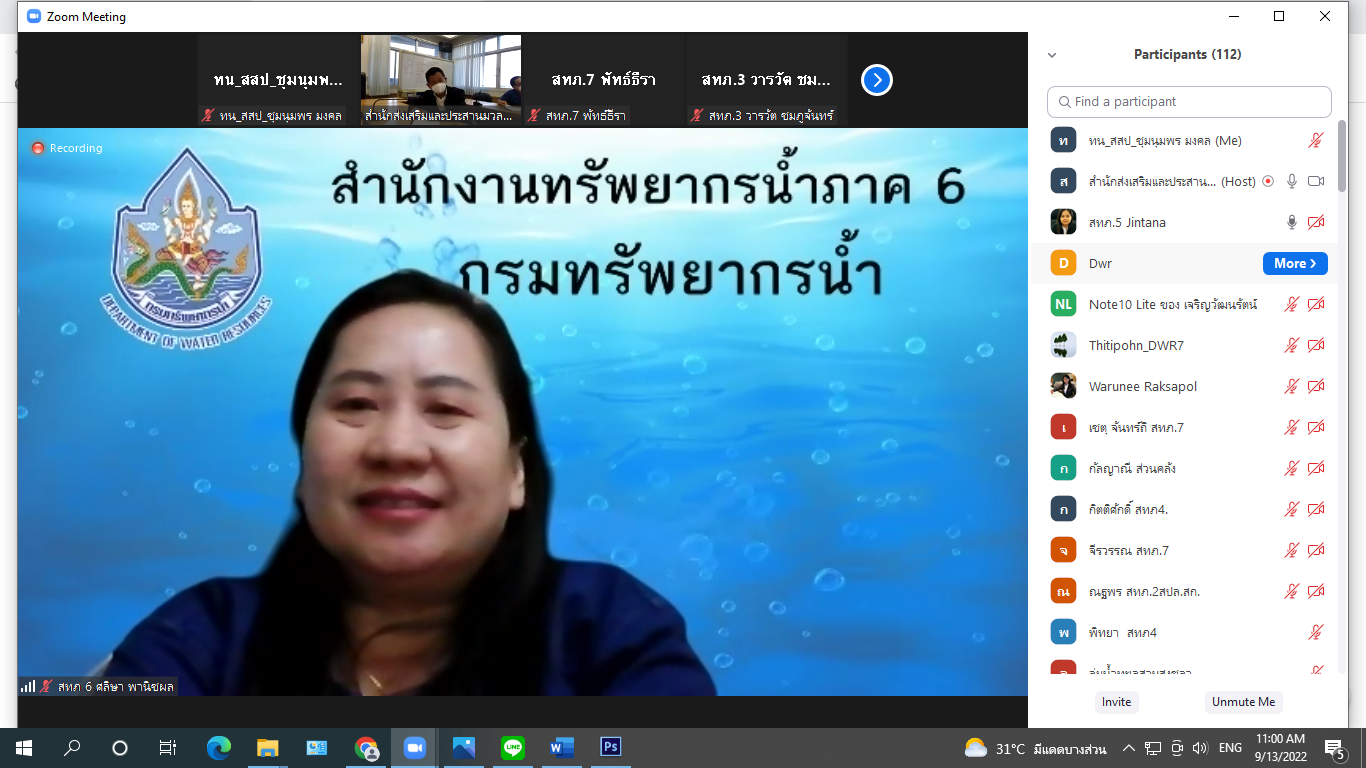 13 ก.ย. 2565 ประชุมชี้แจงและปรึกษาหารือโครงการค่าใช้จ่ายในการเสริมสร้างความเข้มแข็งเครือข่ายกลุ่มผู้ใช้น้ำในพื้นที่เกษตรน้ำฝน (ระยะที่ 1) ณ ห้องประชุม สสป. และผ่านระบบ Zoom โดยมีผู้เข้าร่วมประชุมจากสำนักงานส่วนกลางและสำนักงานทรัพยากรน้ำภาค 1 - 11