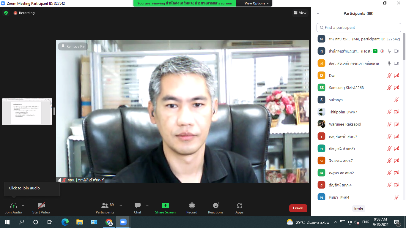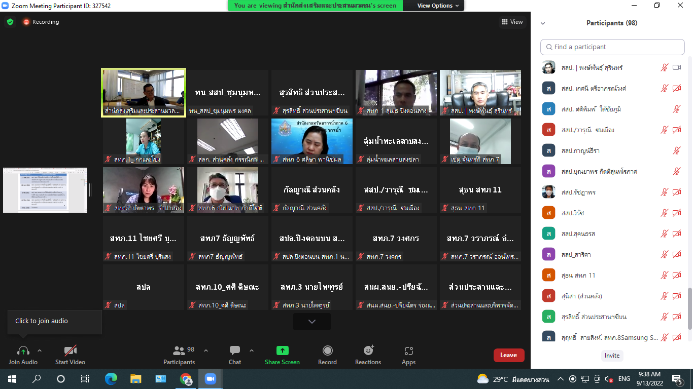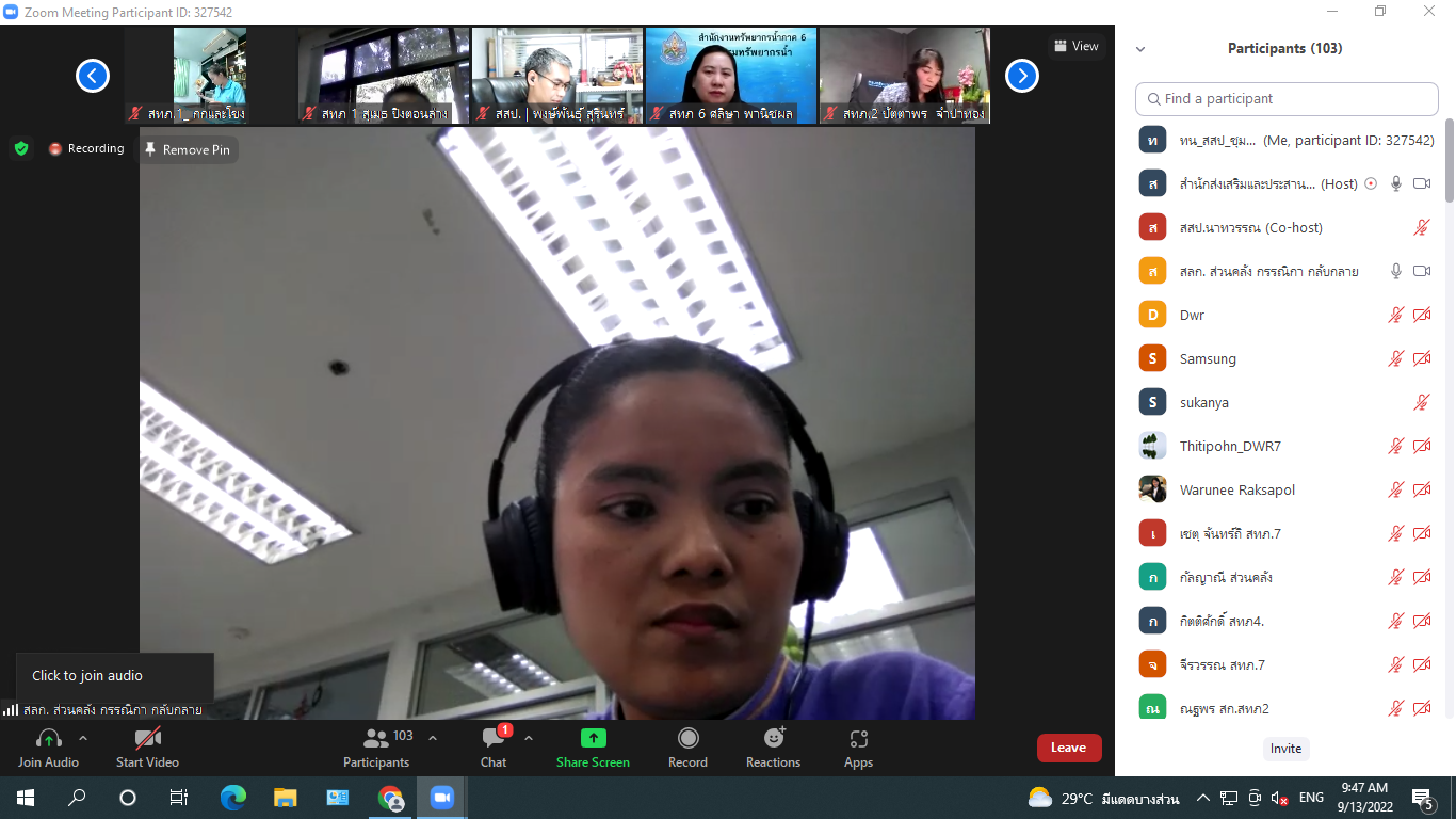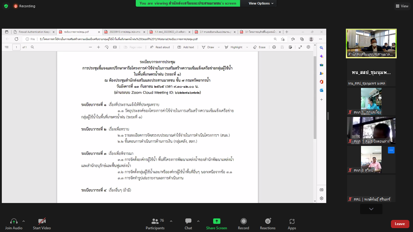 13 ก.ย. 2565 ประชุมชี้แจงและปรึกษาหารือโครงการค่าใช้จ่ายในการเสริมสร้างความเข้มแข็งเครือข่ายกลุ่มผู้ใช้น้ำในพื้นที่เกษตรน้ำฝน (ระยะที่ 1) ณ ห้องประชุม สสป. และผ่านระบบ Zoom โดยมีผู้เข้าร่วมประชุมจากสำนักงานส่วนกลางและสำนักงานทรัพยากรน้ำภาค 1 - 11
