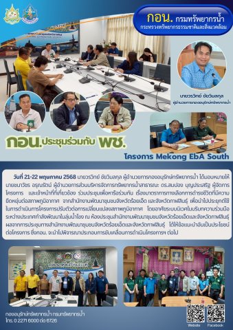 วันที่ 21 - 22 พฤษภาคม 2568 นายวรวิทย์ ชัยวิมลกุล ผู้อำนวยการกองอนุรักษ์ทรัพยากรน้ำ ได้มอบหมายให้ นายชนาวัชร อรุณรัตน์ ผู้อำนวยการส่วนบริหารจัดการทรัพยากรน้ำสาธารณะ ดร.สมปอง บุญประเสริฐ ผู้จัดการโครงการ และเจ้าหน้าที่ที่เกี่ยวข้อง ร่วมประชุมเพื่อหารือร่วมกัน เรื่องมาตราการทางเลือกการดำรงชีวิตที่มีความยืดหยุ่นต่อสภาพภูมิอากาศ จากสำนักงานพัฒนาชุมชนจังหวัดร้อยเอ็ด และจังหวัดกาฬสินธุ์ เพื่อนำไปประยุกต์ใช้ในการดำเนินการโครงการปรับตัวต่อการเปลี่ยนแปลงสภาพภูมิอากาศ โดยอาศัยระบบนิเวศในบริบทความร่วมมือระหว่างประเทศกำลังพัฒนาในลุ่มน้ำโขง ณ ห้องประชุมสำนักงานพัฒนาชุมชนจังหวัดร้อยเอ็ดและจังหวัดกาฬสินธุ์