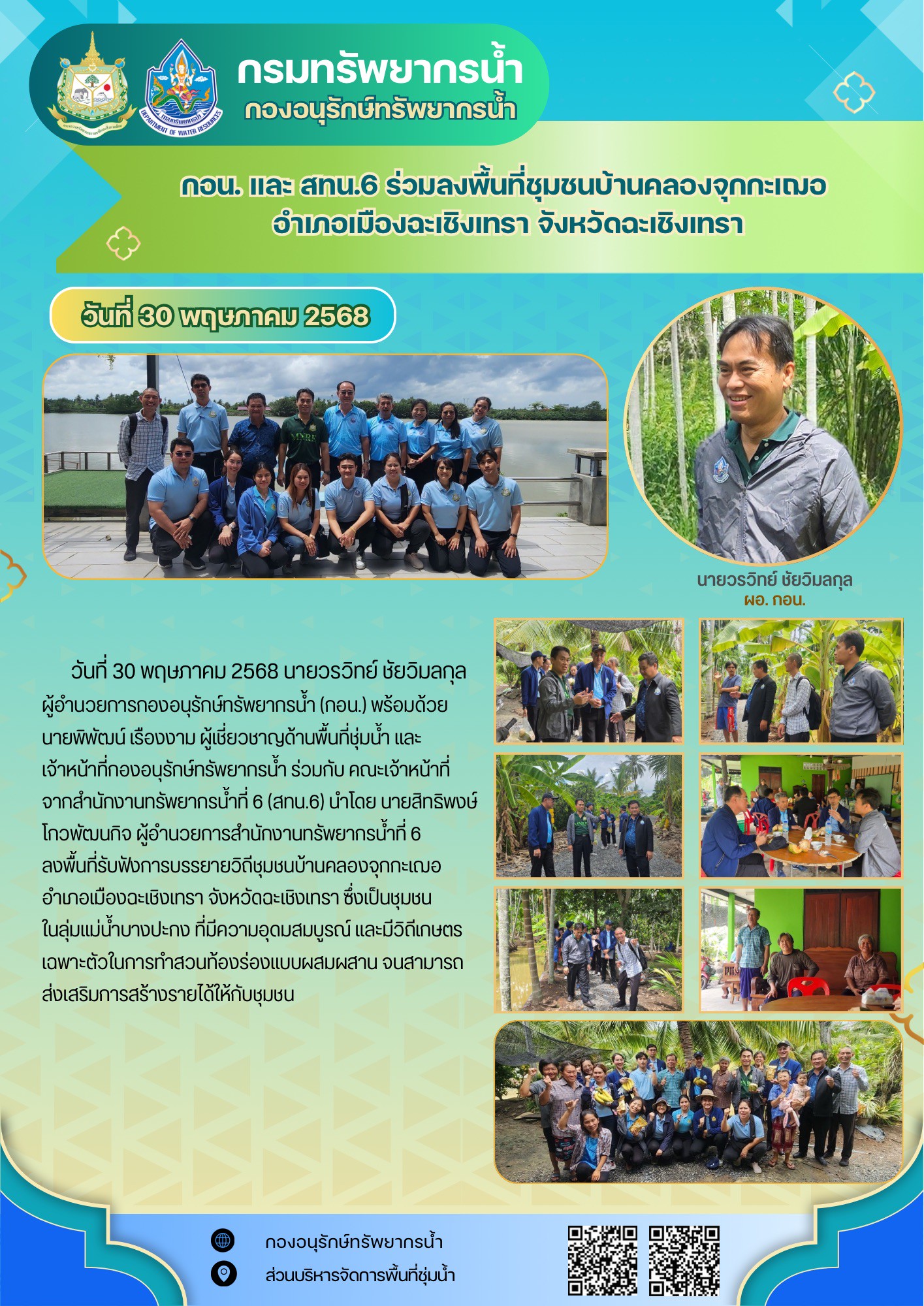 ผู้อำนวยการกองอนุรักษ์ทรัพยากรน้ำ (กอน.) พร้อมด้วย นายพิพัฒน์ เรืองงาม ผู้เชี่ยวชาญด้านพื้นที่ชุ่มน้ำ และเจ้าหน้าที่กองอนุรักษ์ทรัพยากรน้ำ ร่วมกับ คณะเจ้าหน้าที่จากสำนักงานทรัพยากรน้ำที่ 6 (สทน.6) นำโดย นายสิทธิพงษ์ โกวพัฒนกิจ ผู้อำนวยการสำนักงานทรัพยากรน้ำที่ 6 ลงพื้นที่รับฟังการบรรยายวิถีชุมชนบ้านคลองจุกกะเฌอ อำเภอเมืองฉะเชิงเทรา จังหวัดฉะเชิงเทรา ซึ่งเป็นชุมชนในลุ่มแม่น้ำบางปะกง ที่มีความอุดมสมบูรณ์ และมีวิถีเกษตรเฉพาะตัวในการทำสวนท้องร่องแบบผสมผสาน จนสามารถส่งเสริมการสร้างรายได้ให้กับชุมชน