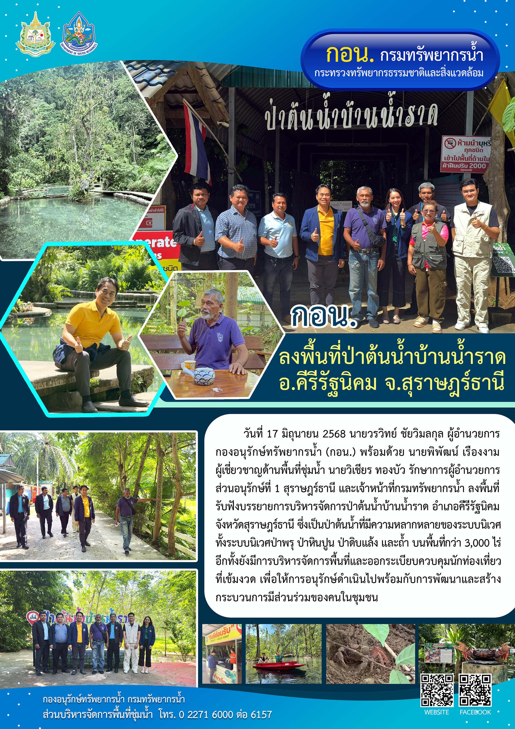 กอน. ลงพื้นที่ป่าต้นน้ำบ้านน้ำราด อำเภอคีรีรัฐนิคม จังหวัดสุราษฎร์ธานี////////// วันที่ 17 มิถุนายน 2568 นายวรวิทย์ ชัยวิมลกุล ผู้อำนวยการกองอนุรักษ์ทรัพยากรน้ำ (กอน.) พร้อมด้วย นายพิพัฒน์ เรืองงาม ผู้เชี่ยวชาญด้านพื้นที่ชุ่มน้ำ นายวิเชียร ทองบัว รักษาการผู้อำนวยการส่วนอนุรักษ์ที่ 1 สุราษฎร์ธานี และเจ้าหน้าที่กรมทรัพยากรน้ำ ลงพื้นที่รับฟังบรรยายการบริหารจัดการป่าต้นน้ำบ้านน้ำราด อำเภอคีรีรัฐนิคม จังหวัดสุราษฎร์ธานี ซึ่งเป็นป่าต้นน้ำที่มีความหลากหลายของระบบนิเวศ ทั้งระบบนิเวศป่าพรุ ป่าหินปูน ป่าดิบแล้ง และถ้ำ บนพื้นที่กว่า 3,000 ไร่ อีกทั้งยังมีการบริหารจัดการพื้นที่และออกระเบียบควบคุมนักท่องเที่ยวที่เข้มงวด เพื่อให้การอนุรักษ์ดำเนินไปพร้อมกับการพัฒนาและสร้างกระบวนการมีส่วนร่วมของคนในชุมชน