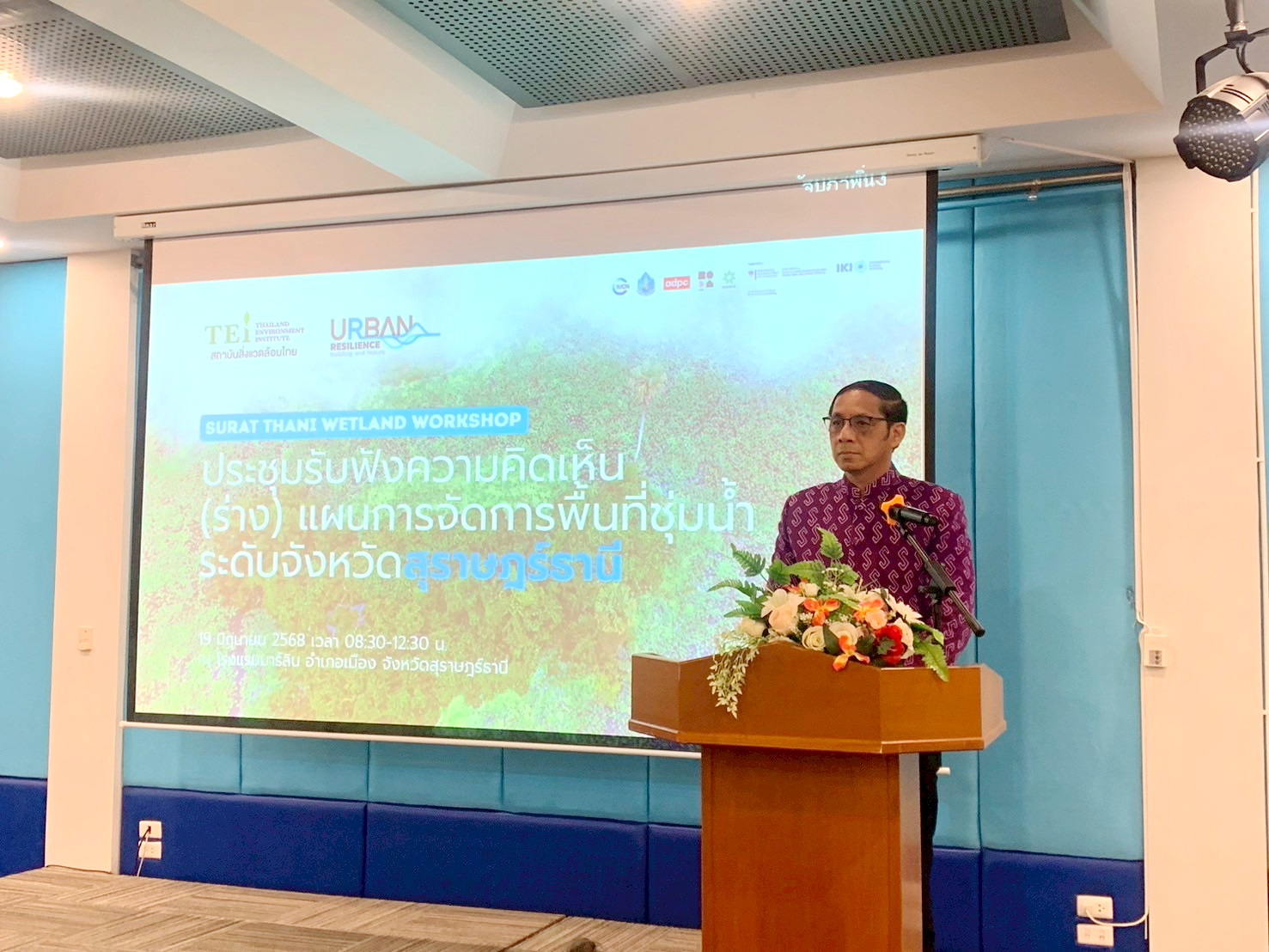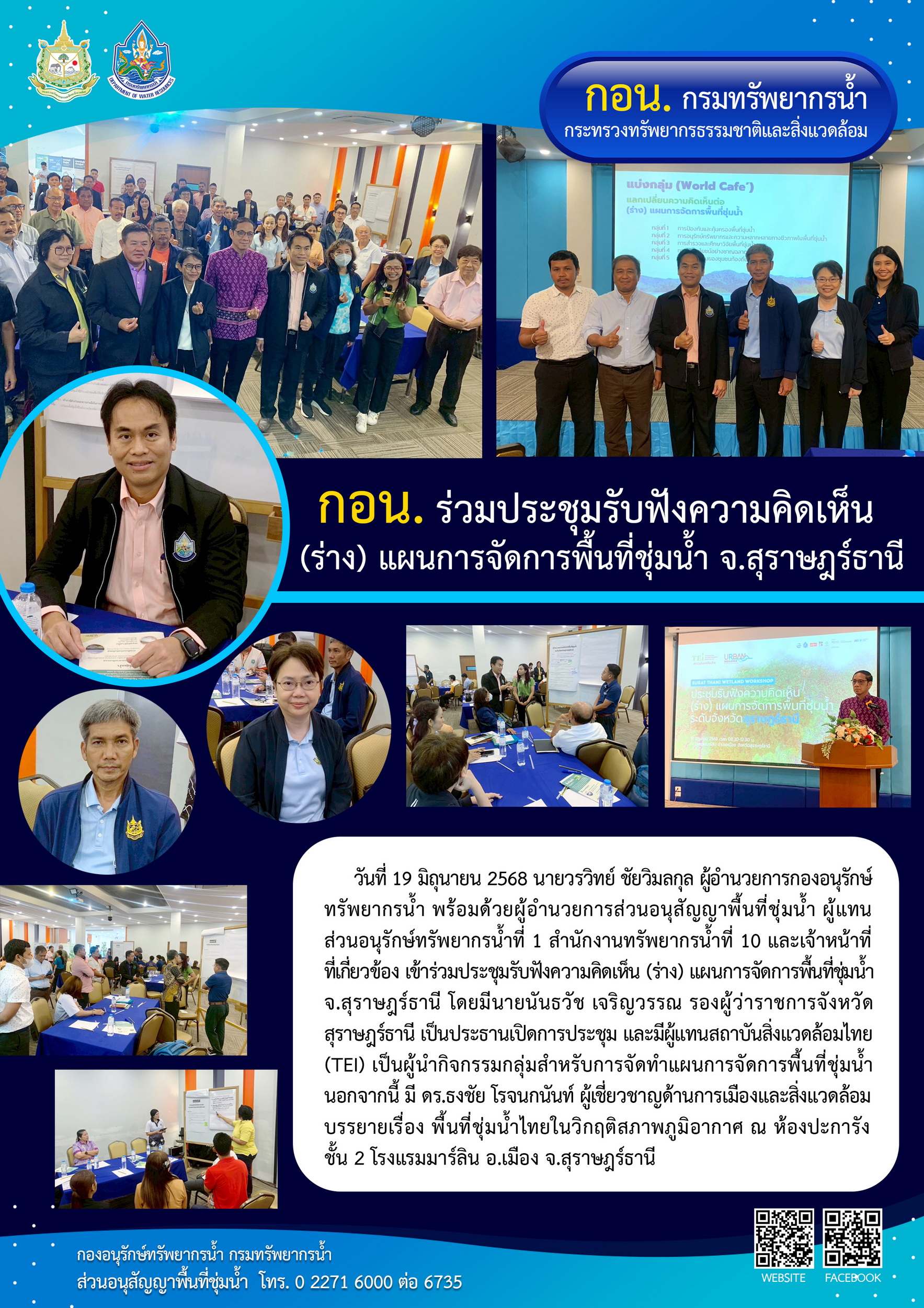วันที่ 19 มิถุนายน 2568 นายวรวิทย์ ชัยวิมลกุล ผู้อำนวยการกองอนุรักษ์ทรัพยากรน้ำ พร้อมด้วยผู้อำนวยการส่วนอนุสัญญาพื้นที่ชุ่มน้ำ ผู้แทนส่วนอนุรักษ์ทรัพยากรน้ำที่ 1 สำนักงานทรัพยากรน้ำที่ 10 และเจ้าหน้าที่ที่เกี่ยวข้อง เข้าร่วมประชุมรับฟังความคิดเห็น (ร่าง) แผนการจัดการพื้นที่ชุ่มน้ำ จ.สุราษฎร์ธานี โดยมีนายนันธวัช เจริญวรรณ รองผู้ว่าราชการจังหวัดสุราษฎร์ธานี เป็นประธานเปิดการประชุม และมีผู้แทนสถาบันสิ่งแวดล้อมไทย (TEI) เป็นผู้นำกิจกรรมกลุ่มสำหรับการจัดทำแผนการจัดการพื้นที่ชุ่มน้ำ นอกจากนี้ มี ดร.ธงชัย โรจนกนันท์ ผู้เชี่ยวชาญด้านการเมืองและสิ่งแวดล้อม บรรยายเรื่อง พื้นที่ชุ่มน้ำไทยในวิกฤติสภาพภูมิอากาศ ณ ห้องปะการัง ชั้น 2 โรงแรมมาร์ลิน อ.เมือง จ.สุราษฎร์ธานี