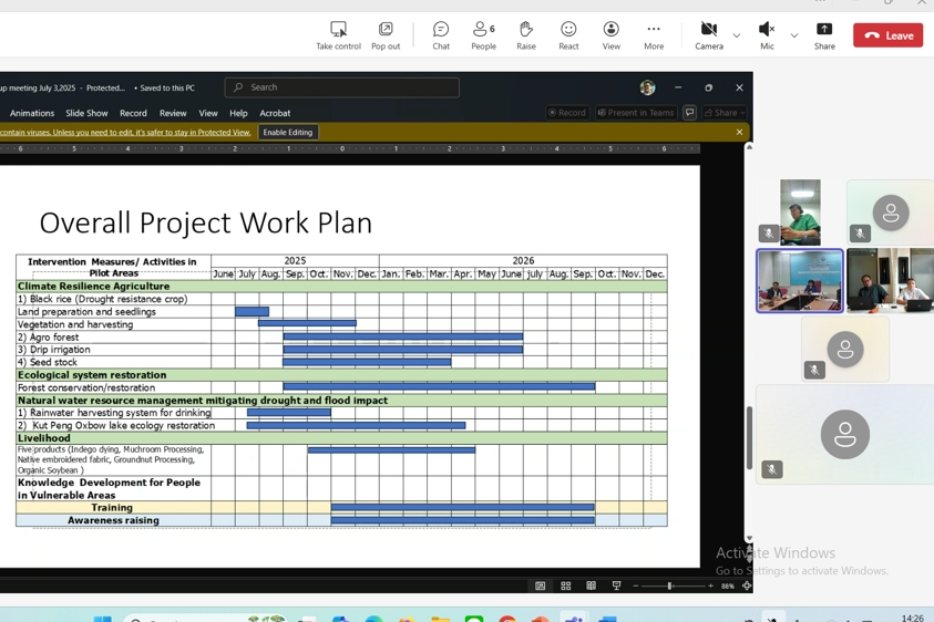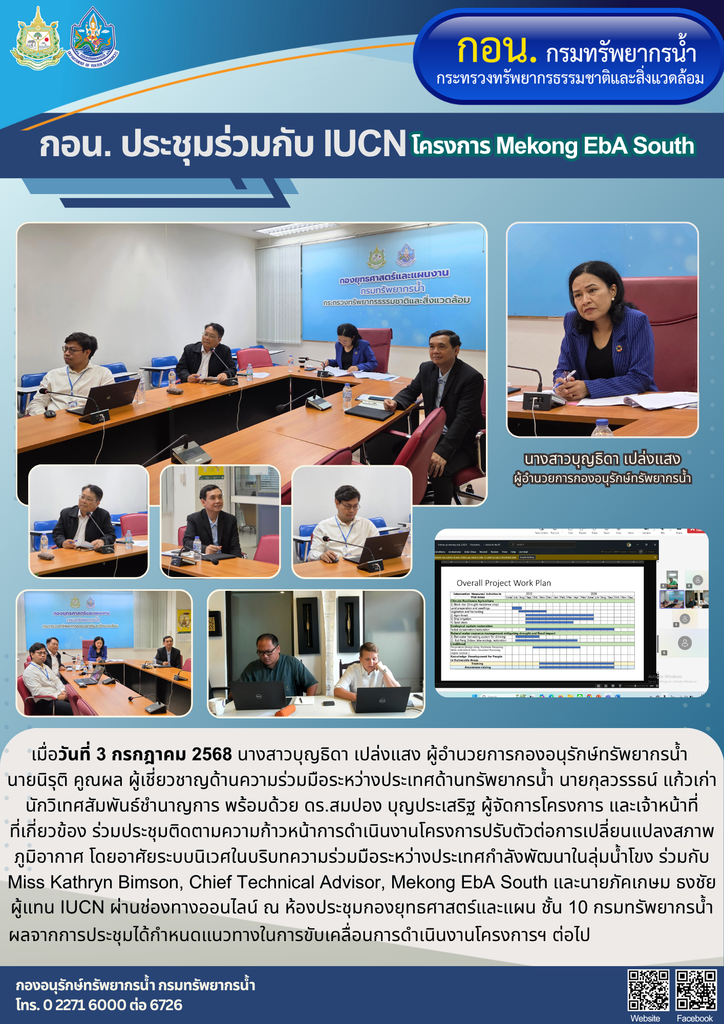 เมื่อวันที่ 3 กรกฎาคม 2568 นางสาวบุญธิดา เปล่งแสง ผู้อำนวยการกองอนุรักษ์ทรัพยากรน้ำ นายนิรุติ คูณผล ผู้เชี่ยวชาญด้านความร่วมมือระหว่างประเทศด้านทรัพยากรน้ำ พร้อมด้วย ดร.สมปอง บุญประเสริฐ ผู้จัดการโครงการ นายกุลวรรธน์ แก้วเก่า นักวิเทศสัมพันธ์ชำนาญการ และเจ้าหน้าที่ที่เกี่ยวข้อง ร่วมประชุมติดตามความก้าวหน้าการดำเนินงานโครงการปรับตัวต่อการเปลี่ยนแปลงสภาพภูมิอากาศ โดยอาศัยระบบนิเวศในบริบทความร่วมมือระหว่างประเทศกำลังพัฒนาในลุ่มน้ำโขง ร่วมกับ Miss Kathryn Bimson, Chief Technical Advisor, Mekong EbA South และนายภัคเกษม ธงชัย ผู้แทน IUCN ผ่านช่องทางออนไลน์ ณ ห้องประชุมกองยุทธศาสตร์และแผน ชั้น 10 กรมทรัพยากรน้ำ ผลจากการประชุมได้กำหนดแนวทางในการขับเคลื่อนการดำเนินงานโครงการฯ ต่อไป