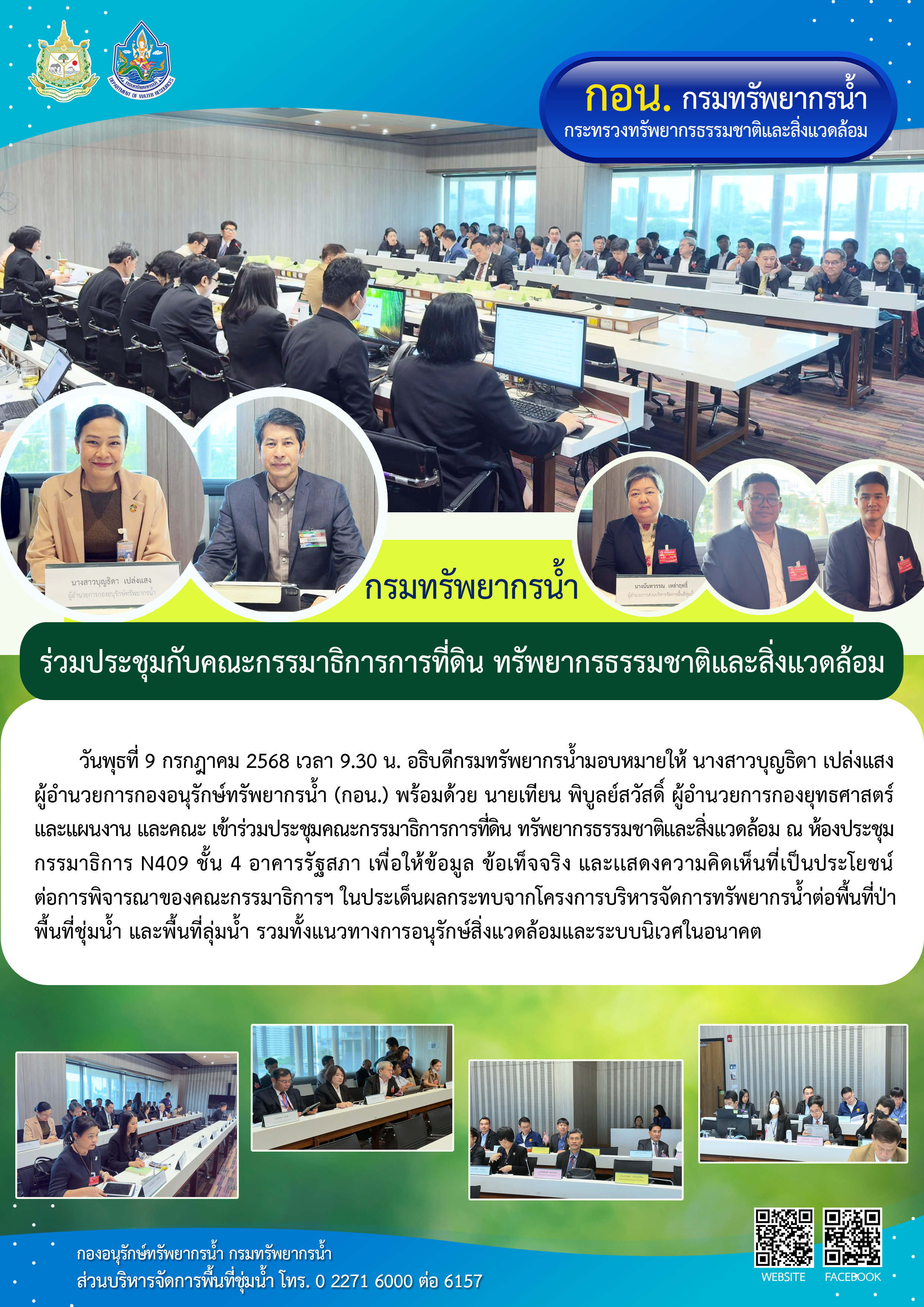 วันพุธที่ 9 กรกฎาคม 2568 เวลา 9.30 น. อธิบดีกรมทรัพยากรน้ำมอบหมายให้ นางสาวบุญธิดา เปล่งแสง ผู้อำนวยการกองอนุรักษ์ทรัพยากรน้ำ (กอน.) พร้อมด้วย นายเทียน พิบูลย์สวัสดิ์ ผู้อำนวยการกองยุทธศาสตร์และแผนงาน และคณะ เข้าร่วมประชุมคณะกรรมาธิการการที่ดิน ทรัพยากรธรรมชาติและสิ่งแวดล้อม ณ ห้องประชุมกรรมาธิการ N409 ชั้น 4 อาคารรัฐสภา เพื่อให้ข้อมูล ข้อเท็จจริง และเเสดงความคิดเห็นที่เป็นประโยชน์ต่อการพิจารณาของคณะกรรมาธิการฯ ในประเด็นผลกระทบจากโครงการบริหารจัดการทรัพยากรน้ำต่อพื้นที่ป่า พื้นที่ชุ่มน้ำ และพื้นที่ลุ่มน้ำ รวมทั้งแนวทางการอนุรักษ์สิ่งแวดล้อมและระบบนิเวศในอนาคต