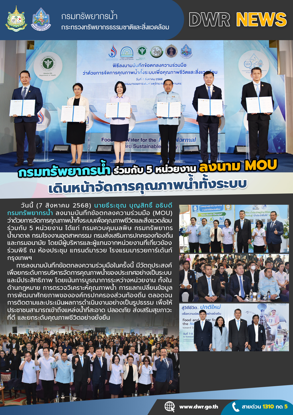 วันนี้ (7 สิงหาคม 2568) นายธีระชุณ บุญสิทธิ์ อธิบดีกรมทรัพยากรน้ำ ลงนามบันทึกข้อตกลงความร่วมมือ (MOU) ว่าด้วยการจัดการคุณภาพน้ำทั้งระบบเพื่อคุณภาพชีวิตและสิ่งแวดล้อม ร่วมกับ 5 หน่วยงาน ได้แก่ กรมควบคุมมลพิษ กรมทรัพยากรน้ำบาดาล กรมโรงงานอุตสาหกรรม กรมส่งเสริมการปกครองท้องถิ่น และกรมอนามัย โดยมีผู้บริหารและผู้แทนจากหน่วยงานที่เกี่ยวข้องร่วมพิธี ณ ห้องประชุม แกรนด์มารวย โรงแรมมารวยการ์เด้นท์ กรุงเทพฯ