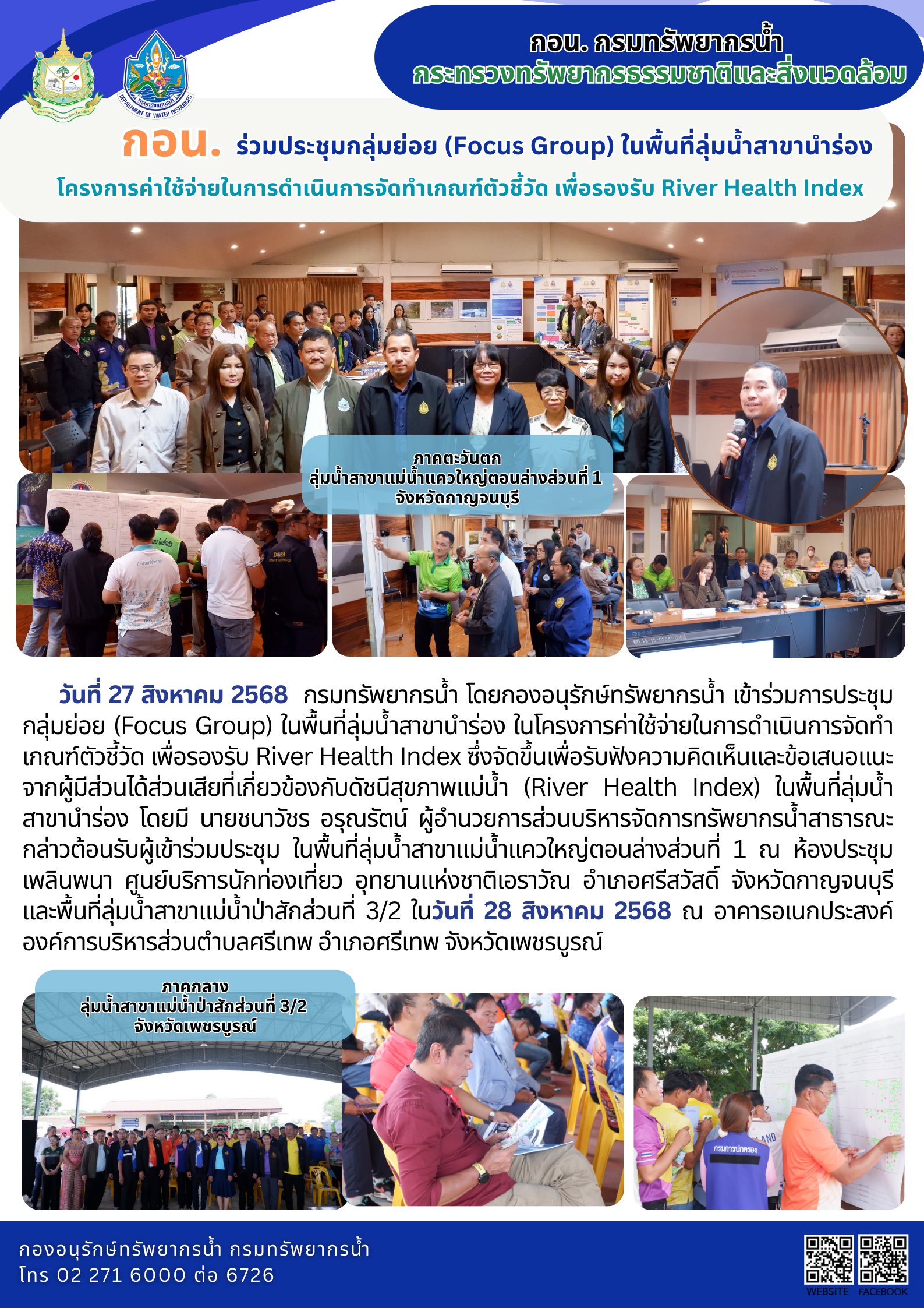 วันที่ 27 สิงหาคม 2568 กรมทรัพยากรน้ำ โดยกองอนุรักษ์ทรัพยากรน้ำ เข้าร่วมการประชุมกลุ่มย่อย (Focus Group) ในพื้นที่ลุ่มน้ำสาขานำร่อง ในโครงการค่าใช้จ่ายในการดำเนินการจัดทำเกณฑ์ตัวชี้วัด เพื่อรองรับ River Health Index ซึ่งจัดขึ้นเพื่อรับฟังความคิดเห็นและข้อเสนอแนะจากผู้มีส่วนได้ส่วนเสียที่เกี่ยวข้องกับดัชนีสุขภาพแม่น้ำ (River Health Index) ในพื้นที่ลุ่มน้ำสาขานำร่อง โดยมี นายชนาวัชร อรุณรัตน์ ผู้อำนวยการส่วนบริหารจัดการทรัพยากรน้ำสาธารณะ กล่าวต้อนรับผู้เข้าร่วมประชุม ในพื้นที่ลุ่มน้ำสาขาแม่น้ำแควใหญ่ตอนล่างส่วนที่ 1 ณ ห้องประชุมเพลินพนา ศูนย์บริการนักท่องเที่ยว อุทยานแห่งชาติเอราวัณ อำเภอศรีสวัสดิ์ จังหวัดกาญจนบุรี และพื้นที่ลุ่มน้ำสาขาแม่น้ำป่าสักส่วนที่ 3/2 ในวันที่ 28 สิงหาคม 2568 ณ อาคารอเนกประสงค์ องค์การบริหารส่วนตำบลศรีเทพ อำเภอศรีเทพ จังหวัดเพชรบูรณ์