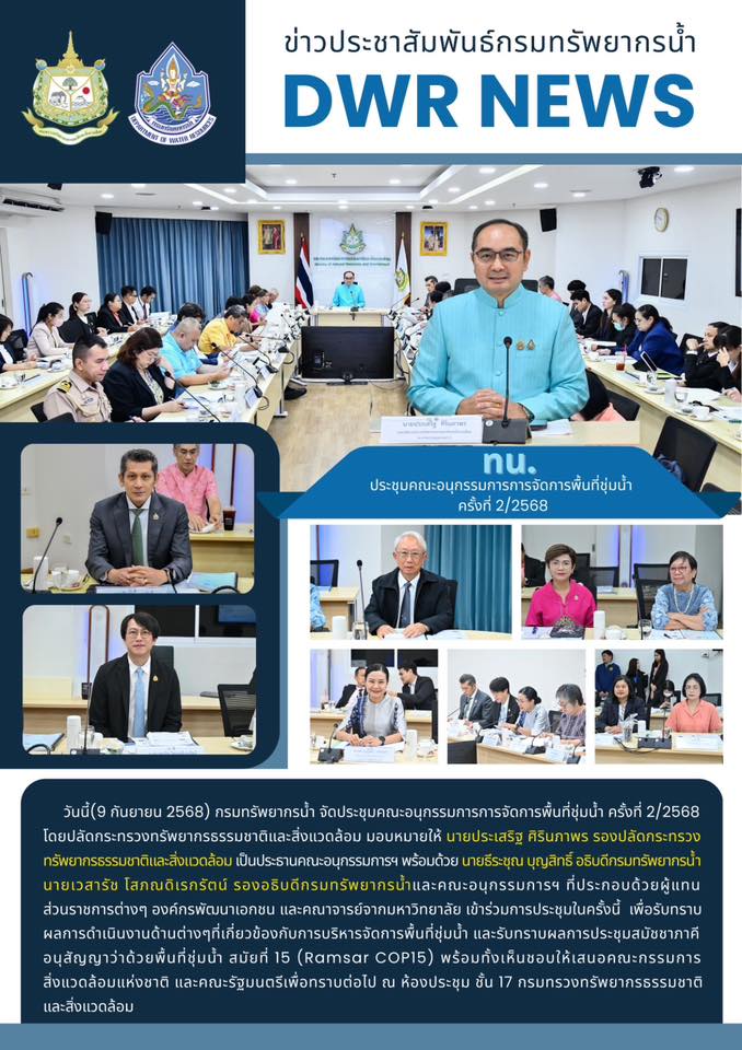วันนี้ (9 กันยายน 2568) กรมทรัพยากรน้ำ จัดประชุมคณะอนุกรรมการการจัดการพื้นที่ชุ่มน้ำ ครั้งที่ 2/2568 โดยปลัดกระทรวงทรัพยากรธรรมชาติและสิ่งแวดล้อม มอบหมายให้ นายประเสริฐ ศิรินภาพร รองปลัดกระทรวงทรัพยากรธรรมชาติและสิ่งแวดล้อม เป็นประธานคณะอนุกรรมการฯ พร้อมด้วย นายธีระชุณ บุญสิทธิ์ อธิบดีกรมทรัพยากรน้ำ นายเวสารัช โสภณดิเรกรัตน์ รองอธิบดีกรมทรัพยากรน้ำและคณะอนุกรรมการฯ ที่ประกอบด้วยผู้แทนส่วนราชการต่างๆ องค์กรพัฒนาเอกชน และคณาจารย์จากมหาวิทยาลัย เข้าร่วมการประชุมในครั้งนี้ เพื่อรับทราบผลการดำเนินงานด้านต่างๆที่เกี่ยวข้องกับการบริหารจัดการพื้นที่ชุ่มน้ำ และรับทราบผลการประชุมสมัชชาภาคีอนุสัญญาว่าด้วยพื้นที่ชุ่มน้ำ สมัยที่ 15 (Ramsar COP 15) พร้อมทั้งเห็นชอบให้เสนอคณะกรรมการสิ่งแวดล้อมแห่งชาติ และคณะรัฐมนตรีเพื่อทราบต่อไป ณ ห้องประชุม ชั้น 17 กรมทรวงทรัพยากรธรรมชาติและสิ่งแวดล้อม