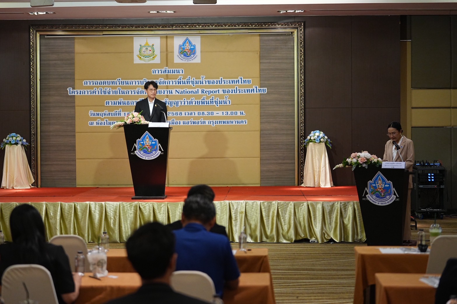 วันนี้ ( 18 กันยายน 2568 ) นายเวสารัช โสภณดิเรกรัตน์ รองอธิบดีกรมทรัพยากรน้ำ เป็นประธานเปิด การสัมมนาถอดบทเรียนการบริหารจัดการพื้นที่ชุ่มน้ำของประเทศไทยในโครงการการจัดทำรายงาน national report ของประเทศไทยตามพันธะกรณีของอนุสัญญาว่าด้วยพื้นที่ชุมน้ำ (Ramsar Convention) โดยมี นางสาวบุญธิดา เปล่งแสง ผู้อำนวยการกองอนุรักษ์ทรัพยากรน้ำ กล่าวรายงาน ณ โรงแรมไมด้า ดอนเมือง แอร์พอร์ต กรุงเทพฯ โดยมีหน่วยงานภาครัฐ ภาคเอกชน ภาคการศึกษา ผู้ทรงคุณวุฒิ และองค์กรพัฒนาเอกชน เข้าร่วมจำนวน 115 คน การสัมมนาถอดบทเรียนฯนี้ เป็นการนำเสนอผลการวิเคราะห์ปัญหาและอุปสรรคในการบริหารจัดการพื้นที่ชุ่มน้ำ 5 แห่ง ได้แก่ 1) พื้นที่ชุ่มน้ำดอนหอยหลอด 2) พื้นที่ชุ่มน้ำกุดทิง 3) พื้นที่ชุ่มน้ำอุทยานแห่งชาติอ่าวพังงา 4) พื้นที่ชุ่มน้ำ เขตรักษาพันธุ์สัตว์ป่า เฉลิมพระเกียรติสมเด็จพระเทพรัตนสุดาฯ (พรุโต๊ะแดง) 5) พื้นที่ชุ่มน้ำอุทยานแห่งชาติหาดเจ้าไหม-เขตห้ามลาสัตว์ป่าหมู่เกาะลิบง-ปากแม่น้ำตรัง เพื่อจัดทำรายงานฯ พร้อมเปิดเวทีรับฟังความคิดเห็น และข้อเสนอแนะต่อผลการศึกษาฯ แนวทางการแก้ไขปัญหาและอุปสรรคในการบริหารจัดการพื้นที่ชุ่มน้ำของประเทศไทย