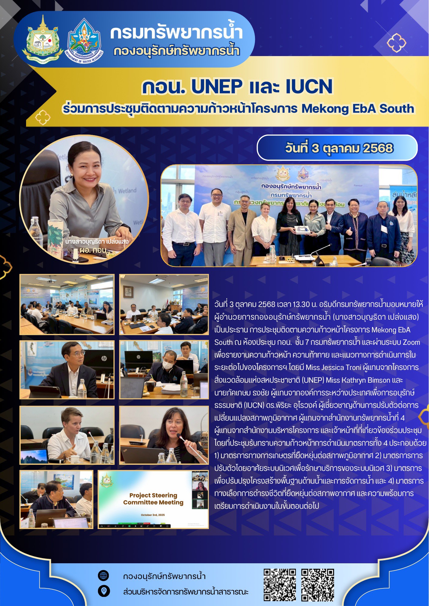 วันที่ 3 ตุลาคม 2568 เวลา 13.30 น. อธิบดีกรมทรัพยากรน้ำ มอบหมายให้ผู้อำนวยการกองอนุรักษ์ทรัพยากรน้ำ (นางสาวบุญธิดา เปล่งแสง) เป็นประธาน การประชุมติดตามความก้าวหน้าโครงการ Mekong EbA South ณ ห้องประชุม กอน. ชั้น 7 กรมทรัพยากรน้ำ และผ่านระบบ Zoom เพื่อรายงานความก้าวหน้า ความท้าทาย และแนวทางการดำเนินการในระยะต่อไปของโครงการฯ โดยมี Miss Jessica Troni ผู้แทนจากโครงการสิ่งแวดล้อมแห่งสหประชาชาติ (UNEP) Miss Kathryn Bimson และนายภัคเกษม ธงชัย ผู้แทนจากองค์การระหว่างประเทศเพื่อการอนุรักษ์ธรรมชาติ (IUCN) ดร.พิริยะ อุไรวงค์ ผู้เชี่ยวชาญด้านการปรับตัวต่อการเปลี่ยนแปลงสภาพภูมิอากาศ ผู้แทนจากสำนักงานทรัพยากรน้ำที่ 4 ผู้แทนจากสำนักงานบริหารโครงการ และเจ้าหน้าที่ที่เกี่ยวข้องร่วมประชุม โดยที่ประชุมรับทราบความก้าวหน้าการดำเนินมาตรการทั้ง 4 ประกอบด้วย 1) มาตรการทางการเกษตรที่ยืดหยุ่นต่อสภาพภูมิอากาศ 2) มาตรการปรับตัวโดยอาศัยระบบนิเวศเพื่อรักษาบริการของระบบนิเวศ 3) มาตรการเพื่อปรับปรุงโครงสร้างพื้นฐานด้านน้ำและการจัดการน้ำ และ 4) มาตรการทางเลือกการดำรงชีวิตที่ยืดหยุ่นต่อสภาพอากาศ และความพร้อมการเตรียมการดำเนินงานในขั้นตอนต่อไป