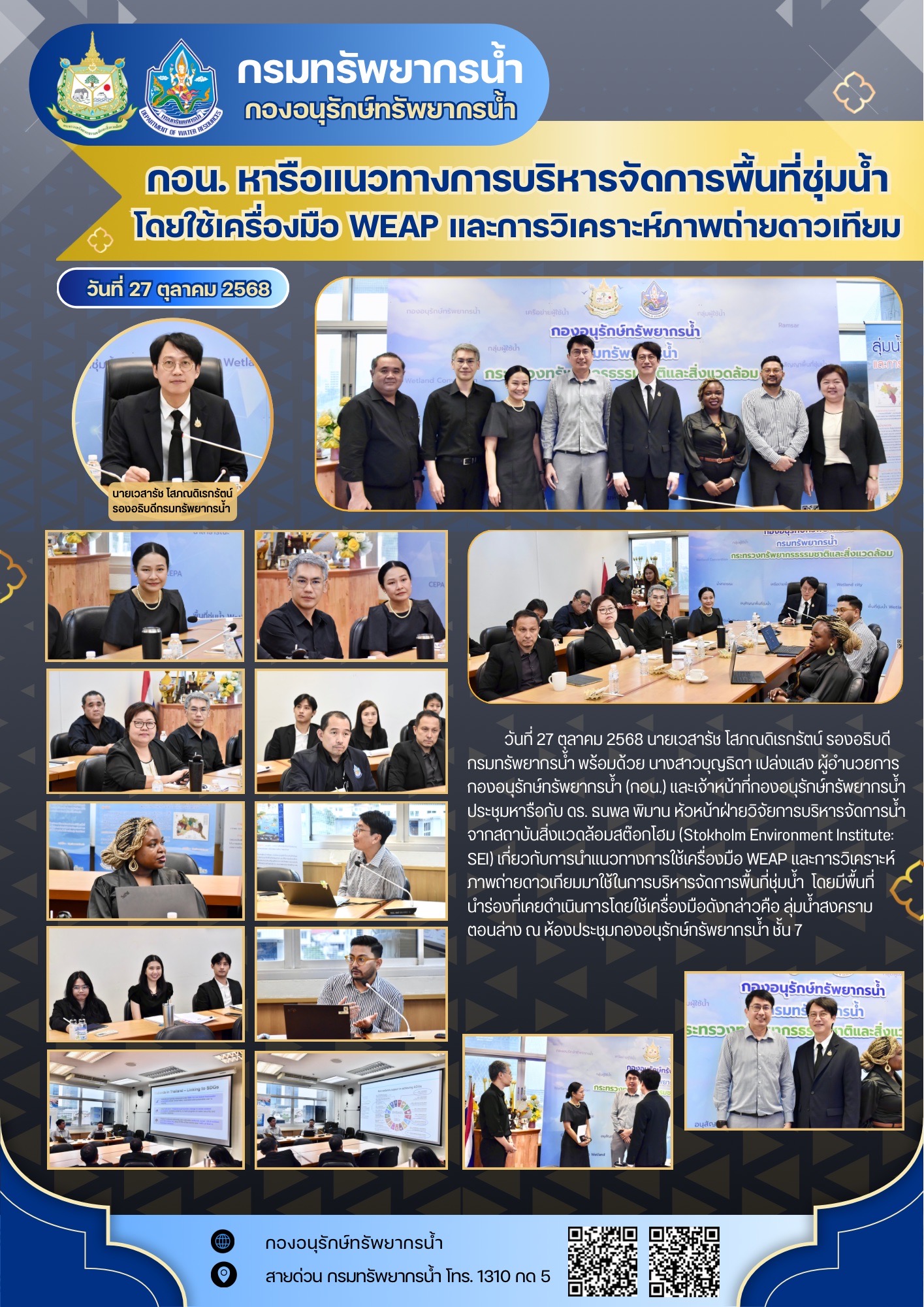 วันที่ 27 ตุลาคม 2568 นายเวสารัช โสภณดิเรกรัตน์ รองอธิบดีกรมทรัพยากรน้ำ พร้อมด้วย นางสาวบุญธิดา เปล่งแสง ผู้อำนวยการกองอนุรักษ์ทรัพยากรน้ำ (กอน.) และเจ้าหน้าที่กองอนุรักษ์ทรัพยากรน้ำ ประชุมหารือกับ ดร. ธนพล พิมาน หัวหน้าฝ่ายวิจัยการบริหารจัดการน้ำ จากสถาบันสิ่งแวดล้อมสต๊อกโฮม (Stokholm Environment Institute: SEI) เกี่ยวกับการนำแนวทางการใช้เครื่องมือ WEAP และการวิเคราะห์ภาพถ่ายดาวเทียมมาใช้ในการบริหารจัดการพื้นที่ชุ่มน้ำ โดยมีพื้นที่นำร่องที่เคยดำเนินการโดยใช้เครื่องมือดังกล่าวคือลุ่มน้ำสงครามตอนล่าง ณ ห้องประชุมกองอนุรักษ์ทรัพยากรน้ำ ชั้น 7
