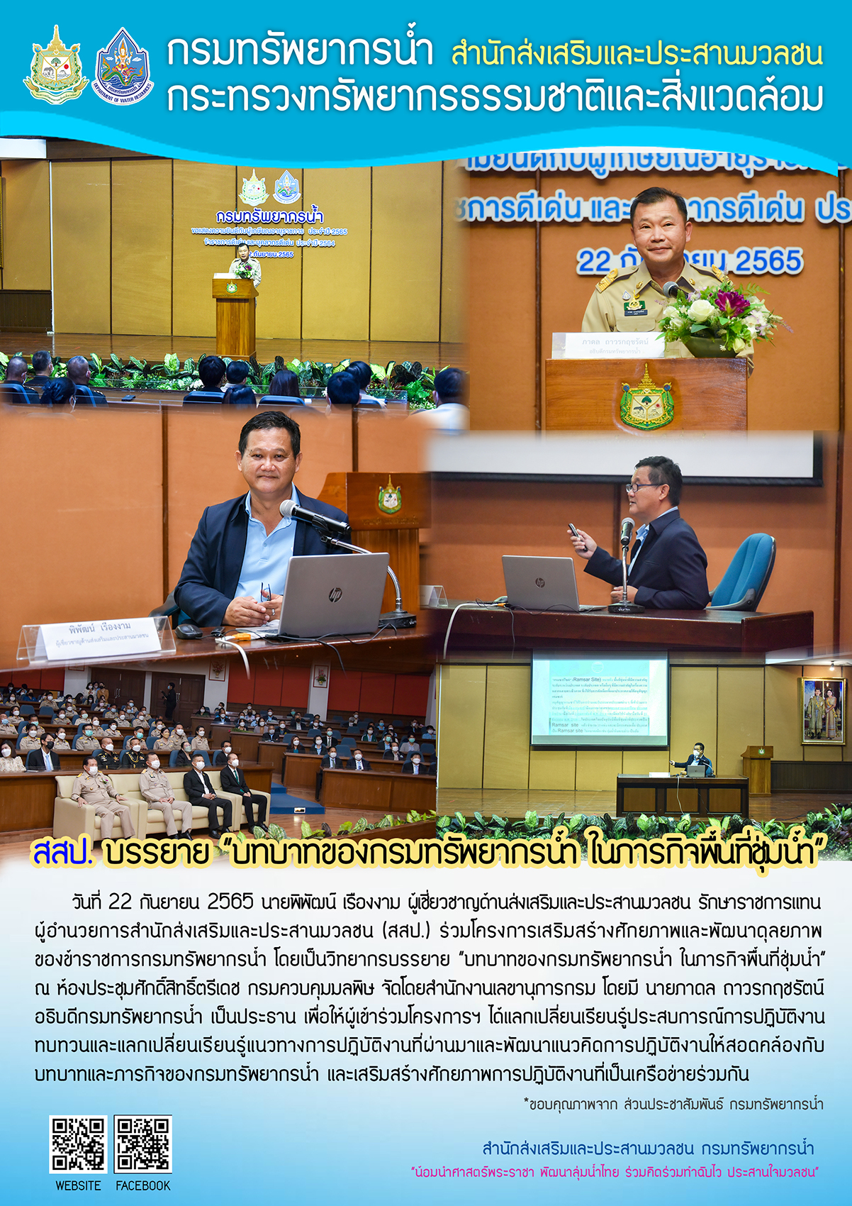 22 ก.ย. 2565 สสป. บรรยาย “บทบาทของกรมทรัพยากรน้ำ ในภารกิจพื้นที่ชุ่มน้ำ”