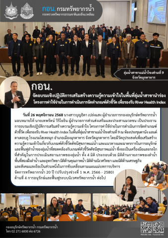 วันที่ 26 พฤศจิกายน 2568 นางสาวบุญธิดา เปล่งแสง ผู้อำนวยการกองอนุรักษ์ทรัพยากรน้ำ มอบหมายให้ นายเทพรัตน์ วิริโยธิน ผู้อำนวยการส่วนส่งเสริมและประสานมวลชน เป็นประธานการอบรมเชิงปฏิบัติการเสริมสร้างความรู้ความเข้าใจ โครงการค่าใช้จ่ายในการดำเนินการจัดทำเกณฑ์ตัวชี้วัด เพื่อรองรับ River Health Index ในพื้นที่ลุ่มน้ำสาขาแม่น้ำโขงส่วนที่ 9 ณ ห้องประชุมดานัง แอนด์ ดาเดอบลู โรงแรมโฮเทลมุก อำเภอเมืองมุกดาหาร จังหวัดมุกดาหาร โดยมีวัตถุประสงค์เพื่อเสริมสร้างความรู้ความเข้าใจเกี่ยวกับเกณฑ์ตัวชี้วัดดัชนีสุขภาพแม่น้ำ และแนวทางและมาตรการในการอนุรักษ์และฟื้นฟูลำน้ำของลุ่มน้ำที่สอดคล้องกับเกณฑ์ตัวชี้วัดดัชนีสุขภาพแม่น้ำ ซึ่งจะเป็นเครื่องมือและกลไกที่สำคัญในการประเมินสถานภาพของลุ่มน้ำ ทั้ง 4 มิติ ประกอบด้วย มิติด้านกายภาพของลำน้ำ พื้นที่สองฝั่งลำน้ำ และอุทกวิทยา มิติด้านคุณภาพน้ำ มิติด้านนิเวศวิทยา และมิติด้านเศรษฐกิจ และสังคมและถือเป็นส่วนหนึ่งในการขับเคลื่อนตามแผนแม่บทการบริหารจัดการทรัพยากรน้ำ 20 ปี (ปรับปรุงช่วงที่ 1 พ.ศ. 2566 - 2580) ด้านที่ 4 การอนุรักษ์และฟื้นฟูระบบนิเวศทรัพยากรน้ำ ต่อไป