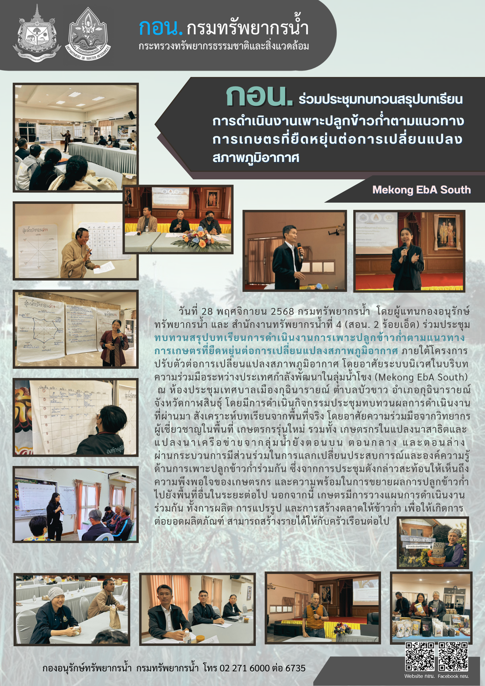 วันที่ 28 พฤศจิกายน 2568 กรมทรัพยากรน้ำ โดยผู้แทนกองอนุรักษ์ทรัพยากรน้ำ และ สำนักงานทรัพยากรน้ำที่ 4 (สอน. 2 ร้อยเอ็ด) ร่วมประชุมทบทวนสรุปบทเรียนการดำเนินงานการเพาะปลูกข้าวก่ำตามแนวทางการเกษตรที่ยืดหยุ่นต่อการเปลี่ยนแปลงสภาพภูมิอากาศ ภายใต้โครงการปรับตัวต่อการเปลี่ยนแปลงสภาพภูมิอากาศ โดยอาศัยระบบนิเวศในบริบท
