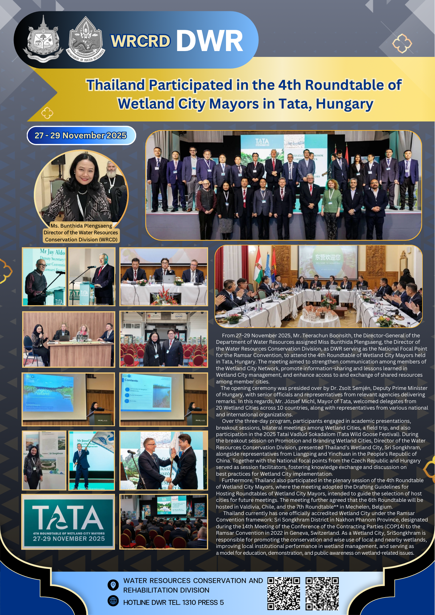 เมื่อวันที่ 27 - 29 พฤศจิกายน 2568 อธิบดีกรมทรัพยากรน้ำมอบหมายให้ผู้อำนวยการกองอนุรักษ์ทรัพยากรน้ำ ในฐานะหน่วยงานประสานงานระดับชาติ (National focal point) อนุสัญญาว่าด้วยพื้นที่ชุ่มน้ำ (Ramsar Convention) เข้าร่วมการประชุมผู้แทนเครือข่ายเมืองแห่งพื้นที่ชุ่มน้ำ ครั้งที่ 4 (4th Roundtable of Wetland City Mayors) ณ เมืองทาทา สาธารณรัฐฮังการี ซึ่งการประชุมดังกล่าวมีวัตถุประสงค์เพื่อเสริมสร้างความเข้มแข็งในการสื่อสารระหว่างเครือข่ายเมืองพื้นที่ชุ่มน้ำและเกิดการแลกเปลี่ยนข้อมูลและบทเรียนที่ได้เรียนรู้ในการบริหารจัดการพื้นที่เมืองและปริมณฑล รวมทั้งส่งเสริมให้เกิดการเข้าถึงและแลกเปลี่ยนทรัพยากรร่วมกันระหว่างเครือข่ายสมาชิก โดยในพิธีเปิดมี Dr. Zsolt Semjén รองนายกรัฐมนตรีฮังการีเป็นประธานกล่าวเปิดงาน พร้อมด้วยผู้บริหารและผู้แทนหน่วยงานที่เกี่ยวข้องร่วมแสดงปาฐกา โดยมี József Michl นายกเทศมนตรีเมืองทาทา ให้การต้อนรับผู้แทน 20 เมืองแห่งพื้นที่ชุ่มน้ำ ใน 10 ประเทศ รวมถึงตัวแทนจากหลายหน่วยงานทั้งในประเทศและต่างประเทศ โดยตลอดระยะเวลา 3 วันของการประชุมจะมีการนำเสนอข้อมูลทางวิชาการ การประชุมกลุ่มย่อย การประชุมทวิภาคีระหว่างเมืองแห่งพื้นที่ชุ่มน้ำ และการเข้าร่วมงาน Tatai Vadlúd Sokadalom (เทศกาลห่านป่าทะเลสาบตาตา) ประจำปี 2568