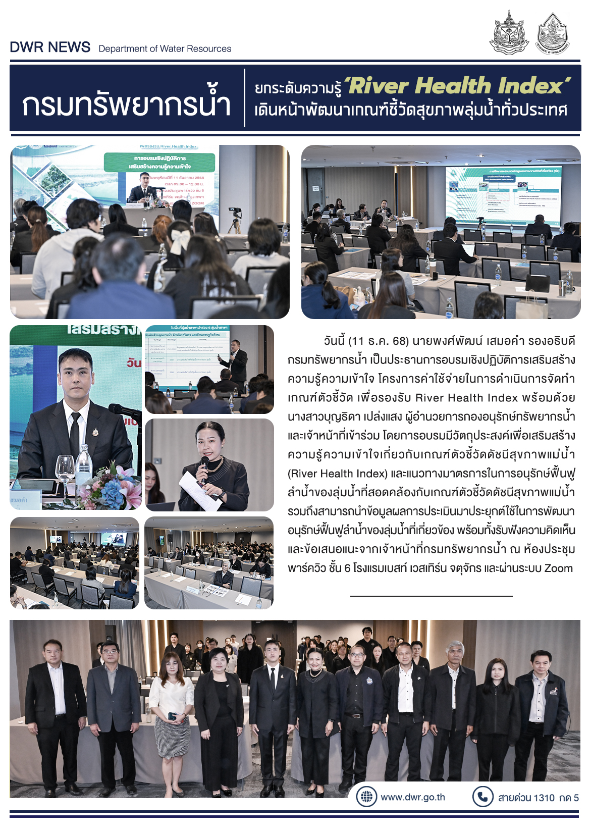 วันนี้ (11 ธ.ค. 68) นายพงศ์พัฒน์ เสมอคำ รองอธิบดีกรมทรัพยากรน้ำ เป็นประธานการอบรมเชิงปฏิบัติการเสริมสร้างความรู้ความเข้าใจ โครงการค่าใช้จ่ายในการดำเนินการจัดทำเกณฑ์ตัวชี้วัด เพื่อรองรับ River Health Index พร้อมด้วย นางสาวบุญธิดา เปล่งแสง ผู้อำนวยการกองอนุรักษ์ทรัพยากรน้ำ และเจ้าหน้าที่เข้าร่วม โดยการอบรมมีวัตถุประสงค์เพื่อเสริมสร้างความรู้ความเข้าใจเกี่ยวกับเกณฑ์ตัวชี้วัดดัชนีสุขภาพแม่น้ำ (River Health Index) และแนวทางมาตรการในการอนุรักษ์ฟื้นฟูลำน้ำของลุ่มน้ำที่สอดคล้องกับเกณฑ์ตัวชี้วัดดัชนีสุขภาพแม่น้ำ รวมถึงสามารถนำข้อมูลผลการประเมินมาประยุกต์ใช้ในการพัฒนา อนุรักษ์ฟื้นฟูลำน้ำของลุ่มน้ำที่เกี่ยวข้อง พร้อมทั้งรับฟังความคิดเห็นและข้อเสนอแนะจากเจ้าหน้าที่กรมทรัพยากรน้ำ ณ ห้องประชุมพาร์ควิว ชั้น 6 โรงแรมเบสท์ เวสเทิร์น จตุจักร และผ่านระบบ Zoom