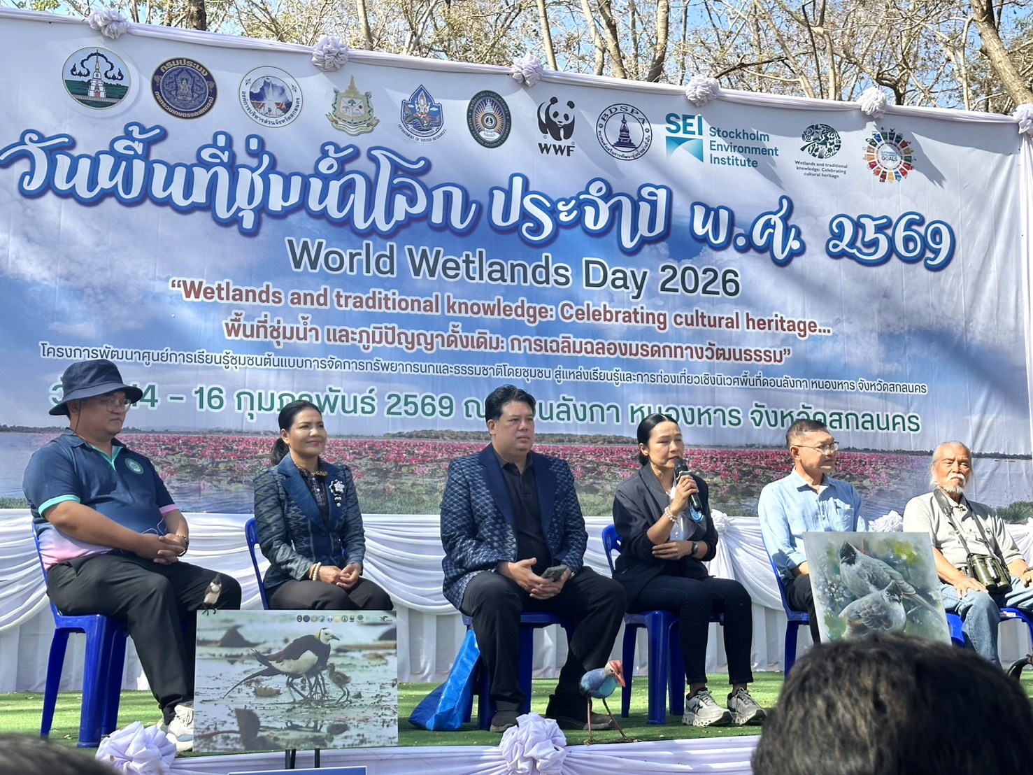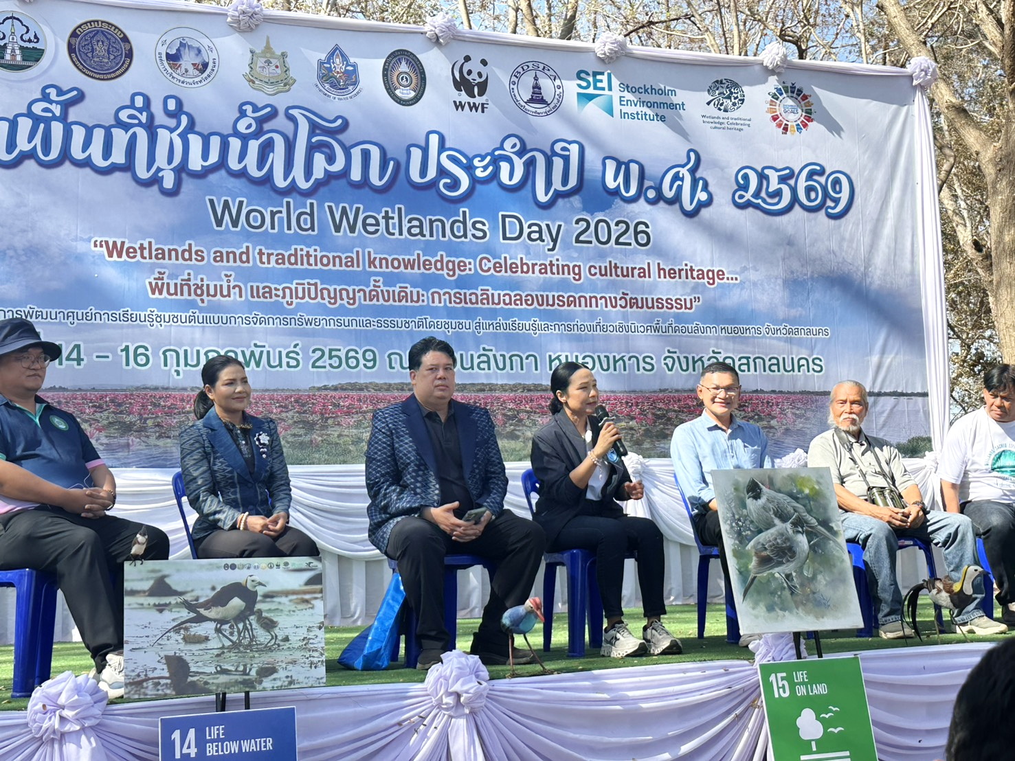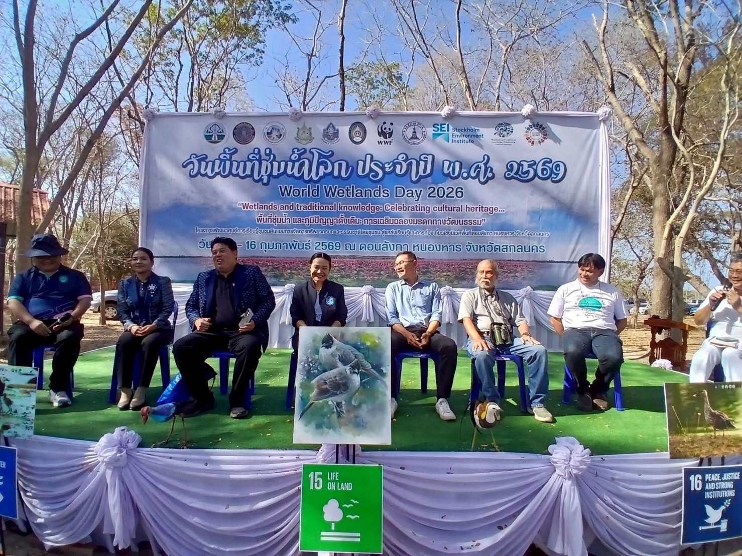 วันที่ 15 กุมภาพันธ์ 2569 นางสาวบุญธิดา เปล่งแสง ผู้อำนวยการกองอนุรักษ์ทรัพยากรน้ำ (กอน.) ผู้แทนกรมทรัพยากรน้ำ ร่วมงานวันพื้นที่ชุ่มน้ำโลก (World Wetlands Day) ณ ดอนขาม ดอนลังกา หนองหาร จังหวัดสกลนคร กิจกรรมจัดขึ้นในวันที่ 14 - 16 กุมภาพันธ์ 2569 ภายใต้โครงการพัฒนาศูนย์การเรียนรู้ชุมชนต้นแบบการจัดการทรัพยากรนกและธรรมชาติโดยชุมชน สู่แหล่งเรียนรู้และการท่องเที่ยวเชิงนิเวศพื้นที่ดอนลังกา หนองหาร จังหวัดสกลนคร โดยสถาบันวิจัยและพัฒนา มหาวิทยาลัยราชภัฏสกลนคร มีหน่วยงานภาครัฐ ภาคประชาชน และเครือข่ายด้านสิ่งแวดล้อมเข้าร่วมกิจกรรม