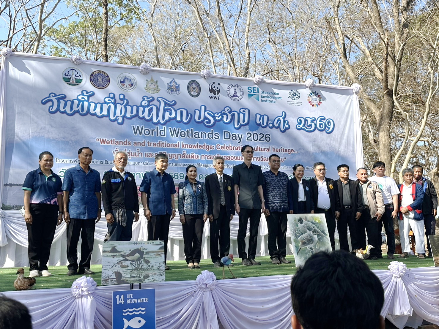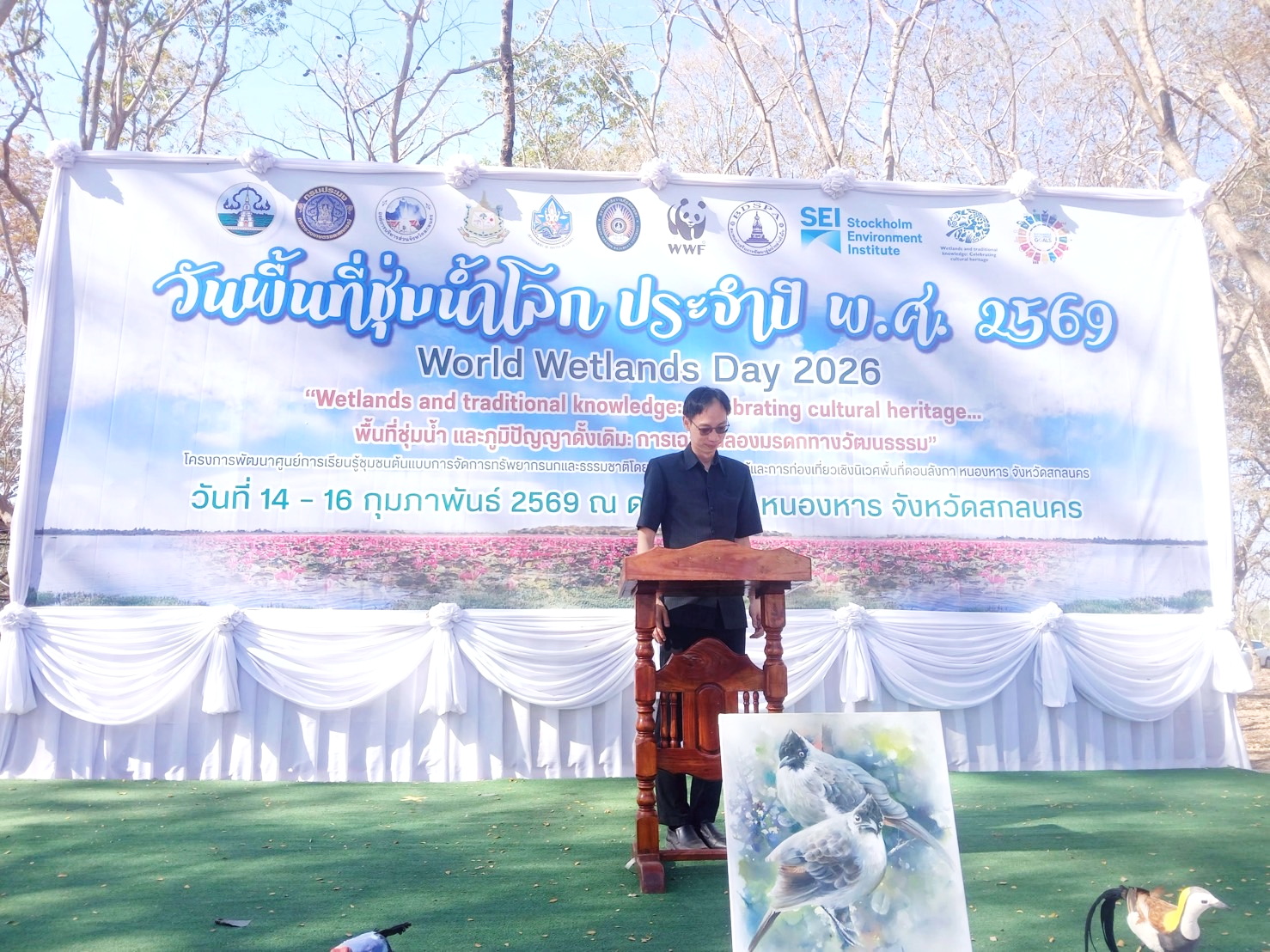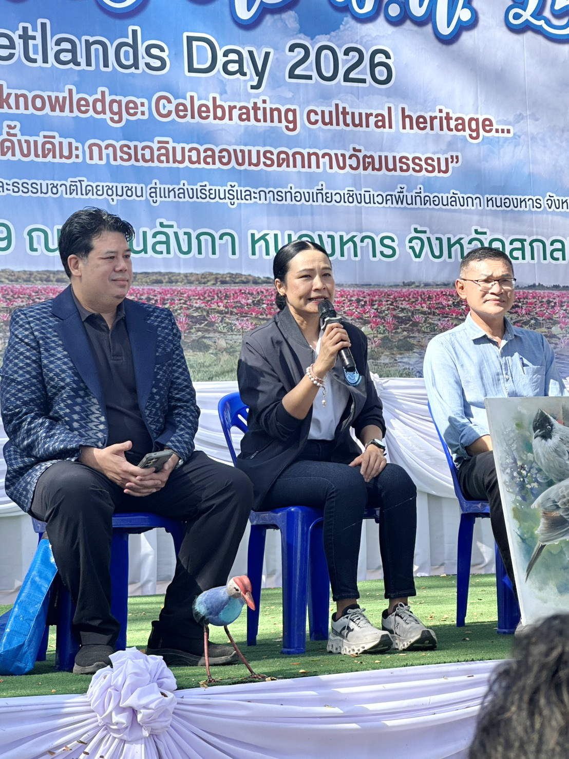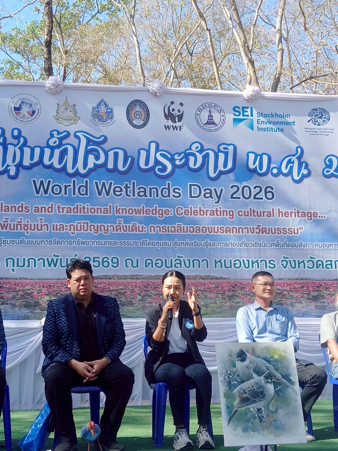 วันที่ 15 กุมภาพันธ์ 2569 นางสาวบุญธิดา เปล่งแสง ผู้อำนวยการกองอนุรักษ์ทรัพยากรน้ำ (กอน.) ผู้แทนกรมทรัพยากรน้ำ ร่วมงานวันพื้นที่ชุ่มน้ำโลก (World Wetlands Day) ณ ดอนขาม ดอนลังกา หนองหาร จังหวัดสกลนคร กิจกรรมจัดขึ้นในวันที่ 14 - 16 กุมภาพันธ์ 2569 ภายใต้โครงการพัฒนาศูนย์การเรียนรู้ชุมชนต้นแบบการจัดการทรัพยากรนกและธรรมชาติโดยชุมชน สู่แหล่งเรียนรู้และการท่องเที่ยวเชิงนิเวศพื้นที่ดอนลังกา หนองหาร จังหวัดสกลนคร โดยสถาบันวิจัยและพัฒนา มหาวิทยาลัยราชภัฏสกลนคร มีหน่วยงานภาครัฐ ภาคประชาชน และเครือข่ายด้านสิ่งแวดล้อมเข้าร่วมกิจกรรม