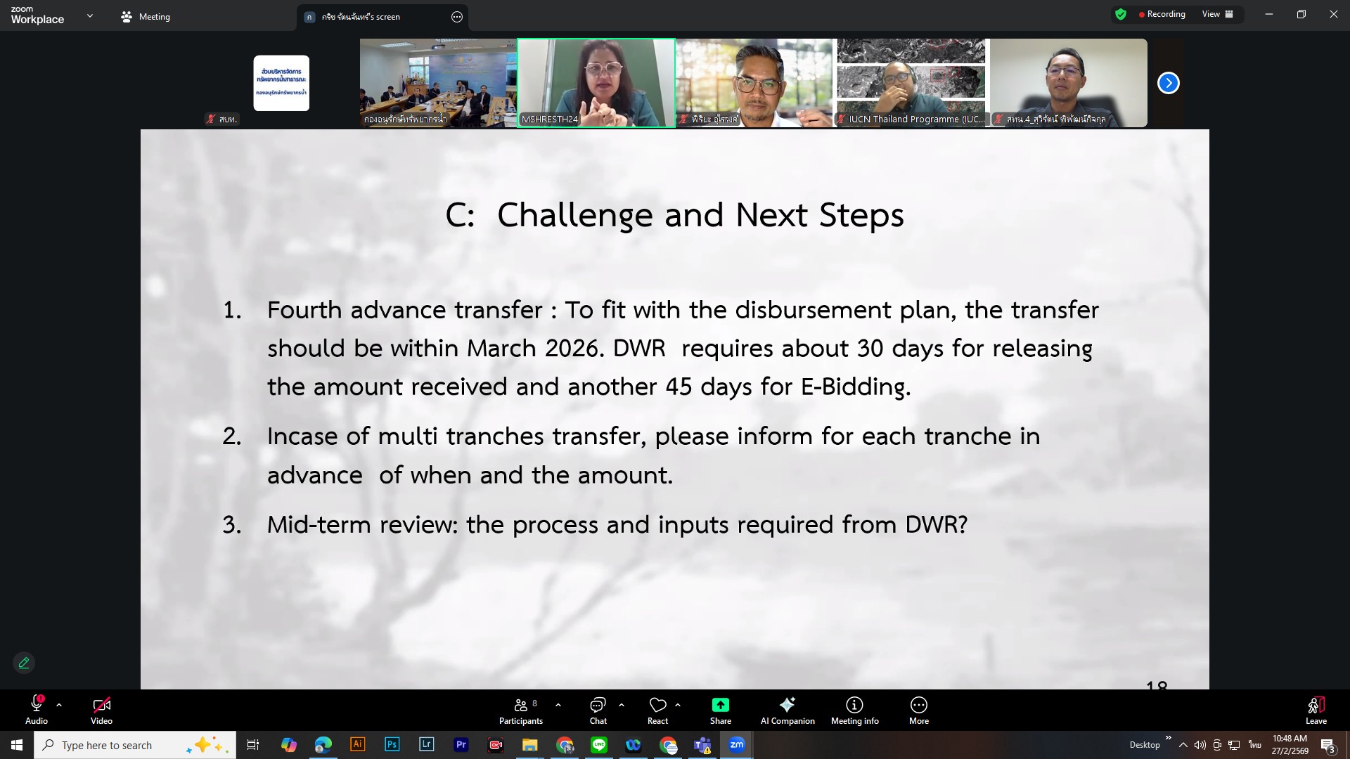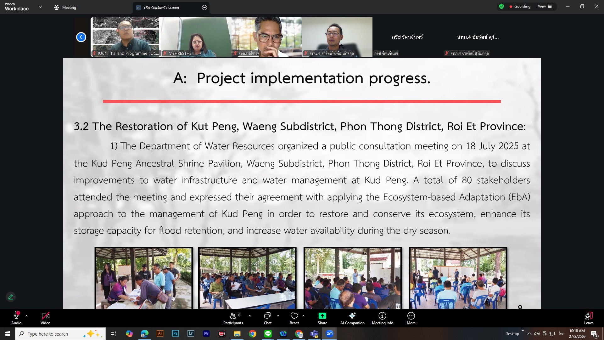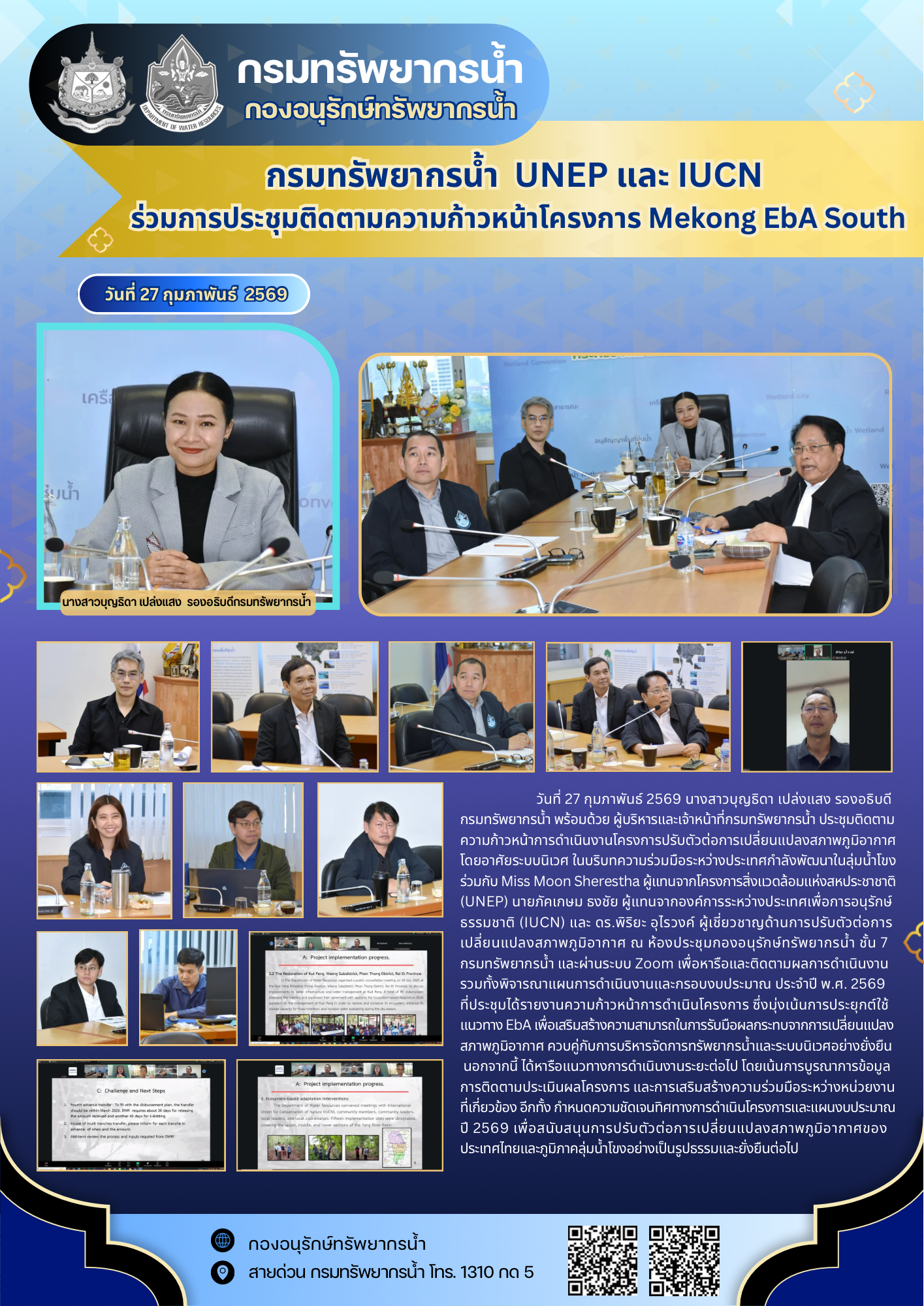วันที่ 27 กุมภาพันธ์ 2569 นางสาวบุญธิดา เปล่งแสง รองอธิบดีกรมทรัพยากรน้ำ พร้อมด้วยผู้บริหารและเจ้าหน้าที่กรมทรัพยากรน้ำ ประชุมติดตามความก้าวหน้าการดำเนินงานโครงการปรับตัวต่อการเปลี่ยนแปลงสภาพภูมิอากาศโดยอาศัยระบบนิเวศ ในบริบทความร่วมมือระหว่างประเทศกำลังพัฒนาในลุ่มน้ำโขง ร่วมกับ Miss Moon Sherestha ผู้แทนจากโครงการสิ่งแวดล้อมแห่งสหประชาชาติ (UNEP) นายภัคเกษม ธงชัย ผู้แทนจากองค์การระหว่างประเทศเพื่อการอนุรักษ์ธรรมชาติ (IUCN) และ ดร.พิริยะ อุไรวงค์ ผู้เชี่ยวชาญด้านการปรับตัวต่อการเปลี่ยนแปลงสภาพภูมิอากาศ ณ ห้องประชุมกองอนุรักษ์ทรัพยากรน้ำ ชั้น 7 กรมทรัพยากรน้ำ และผ่านระบบ Zoom