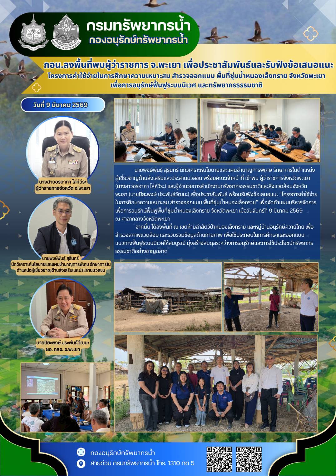 นายพงษ์พันธุ์ สุรินทร์ นักวิเคราะห์นโยบายและแผนชำนาญการพิเศษ รักษาการในตำแหน่งผู้เชี่ยวชาญด้านส่งเสริมและประสานมวลชน พร้อมคณะเจ้าหน้าที่ เข้าพบ ผู้ว่าราชการจังหวัดพะเยา (นางสาวอรอาภา โล่ห์วีระ) และผู้อำนวยการสำนักงานทรัพยากรธรรมชาติและสิ่งแวดล้อมจังหวัดพะเยา (นายปิยะพงษ์ ประพันธ์วัฒนะ) เพื่อประชาสัมพันธ์ พร้อมรับฟังข้อเสนอแนะ “โครงการค่าใช้จ่ายในการศึกษาความเหมาะสม สำรวจออกแบบ พื้นที่ชุ่มน้ำหนองเล็งทราย” เพื่อจัดทำแผนบริหารจัดการ เพื่อการอนุรักษ์ฟื้นฟูพื้นที่ชุ่มน้ำหนองเล็งทราย จังหวัดพะเยา เมื่อวันจันทร์ที่ 9 มีนาคม 2569 ณ ศาลากลางจังหวัดพะเยา