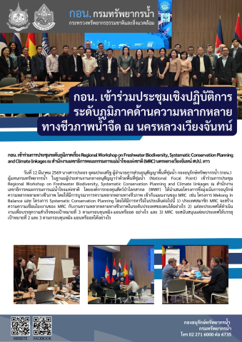 กอน. เข้าร่วมการประชุมระดับภูมิภาคเรื่อง Regional Workshop on Freshwater Biodiversity, Systematic Conservation Planning and Climate linkages ณ สำนักงานเลขาธิการคณะกรรมการแม่น้ำโขงแห่งชาติ (MRC) นครหลวงเวียงจันทน์ สปป. ลาว